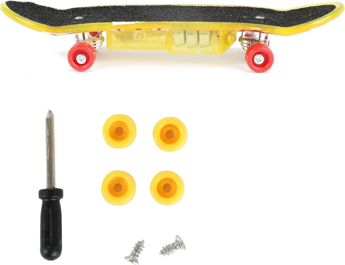Questo skateboard da dito combina un design accattivante con funzioni pratiche. La tavola in plastica traslucida con superficie grip garantisce stabilità alle dita, mentre le ruote rosse e i truck in metallo offrono una guida fluida. La luce LED integrata aggiunge effetto ai trick e divertimento anche in condizioni di scarsa illuminazione.