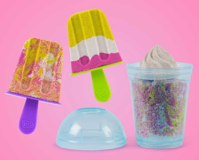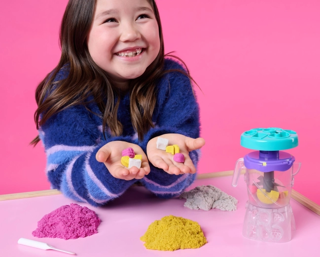 Con il Kinetic Sand smoothie mixer i bambini imparano a mescolare i colori e a stratificare “bevande” e “dessert” in bicchieri o stampini per ghiaccioli. Basta versare la sabbia nel coperchio del mixer, girare manualmente e osservare come nascono nuove tonalità e texture realistiche. La sabbia cinetica sembra bagnata, ma le mani restano asciutte e la superficie di lavoro più pulita.