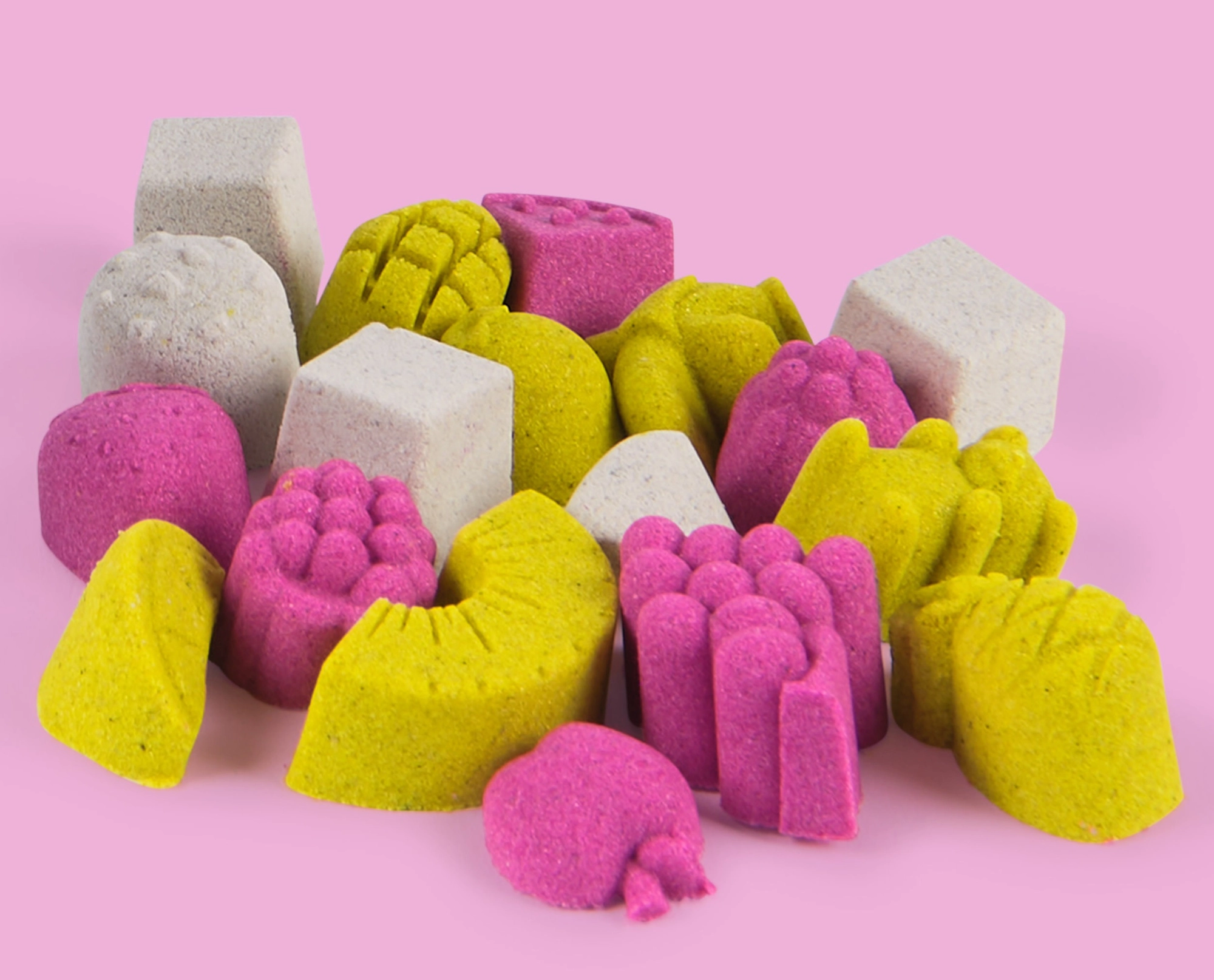 La sabbia di qualità riproduce perfettamente i dettagli degli stampi, così i bambini creano facilmente forme, glasse e accessori. Il gioco favorisce scenari di ruolo (pasticceria, cucina, gelateria), la motricità fine e la percezione sensoriale.