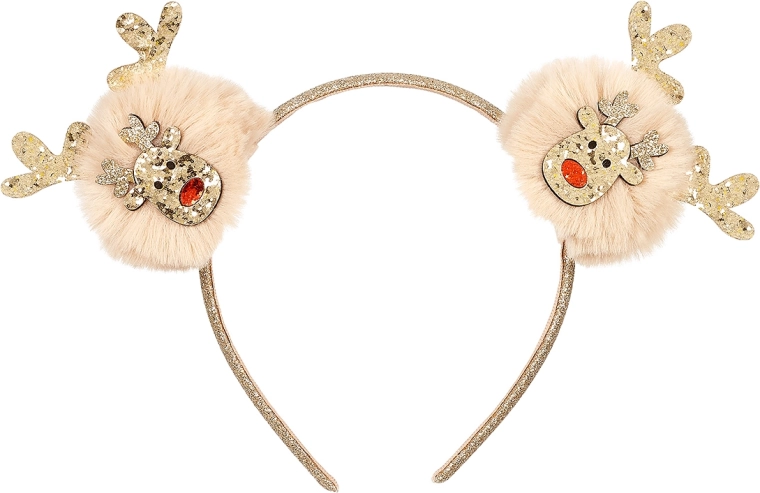 Porta un’atmosfera magica nei giorni di festa con l’elegante cerchietto SOUZA. Grazie alla base in metallo sottile da 0,8 cm rivestita con nastro scintillante, è piacevole da indossare e mantiene la forma per tutto il giorno. Due soffici pon pon beige con applicazioni di renne e corna cosparse di glitter dorati donano a ogni acconciatura un look giocoso ma sempre raffinato.