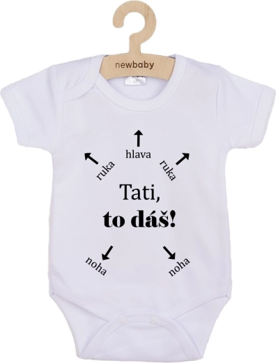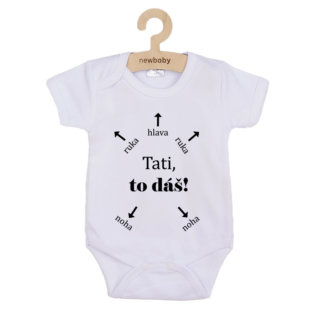 Comodo body per bambini a manica corta con la scritta originale Papà, ce la farai! del marchio NEW BABY. Realizzato in 100% cotone morbido, soffice, traspirante e delicato sulla pelle sensibile dei neonati. La pratica chiusura a bottoncini a pressione sulla spalla e tra le gambine facilita la vestizione e il cambio. I colori della stampa sono certificati e sicuri per i neonati.