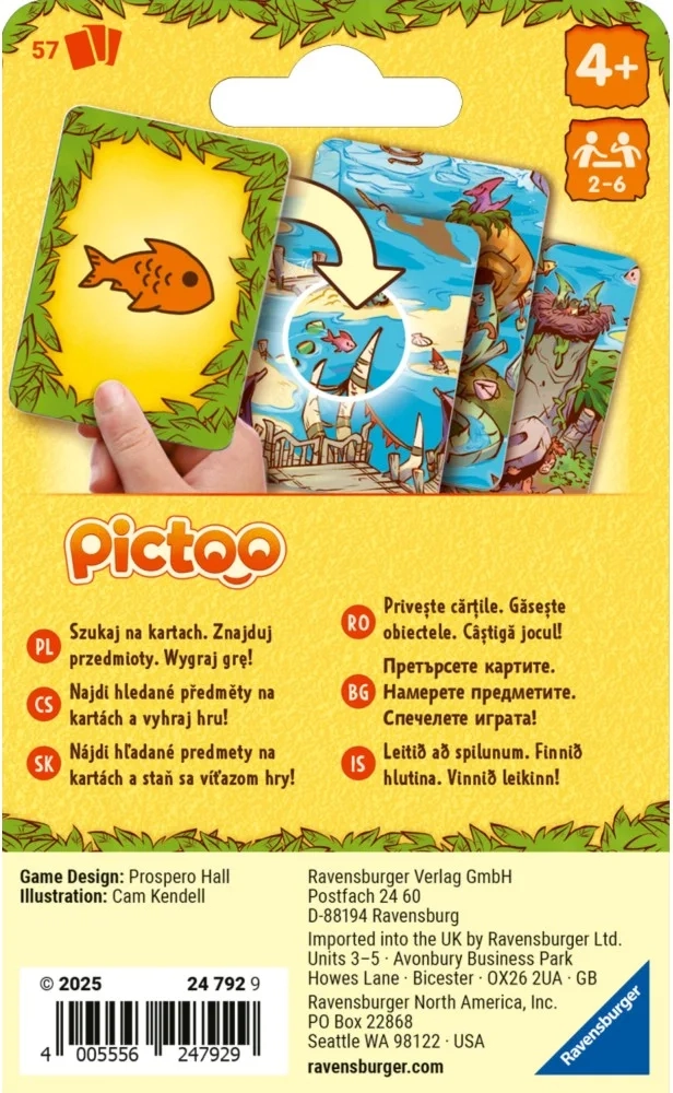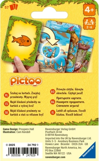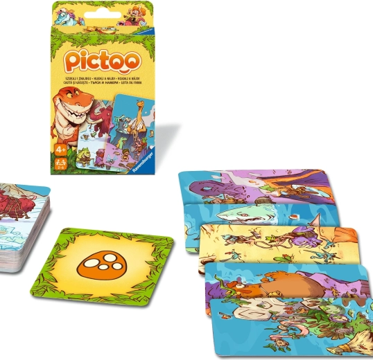 Goditi il veloce gioco di colpo d’occhio Ravensburger Pictoo: dinosauri, in cui i giocatori cercano oggetti sulle carte e cercano di scartare tutte le proprie carte il più rapidamente possibile. Un divertimento perfetto per famiglie e amici con temi di dinosauri amatissimi – vince il più rapido!