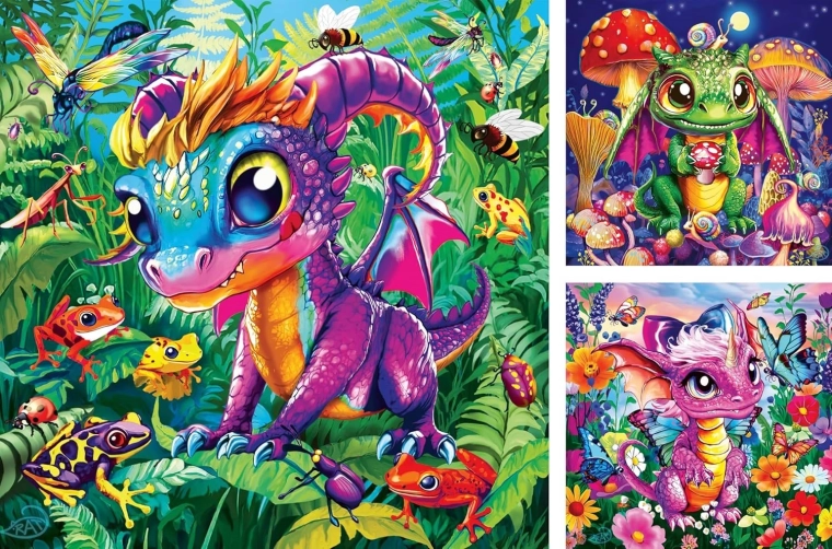 Il set di puzzle per bambini RAVENSBURGER propone tre graziose illustrazioni di draghetti che esplorano la natura. Ogni immagine da 49 pezzi conquista con colori vivaci, tagli precisi e una superficie piacevole. Grazie alle dimensioni contenute, la composizione è una sfida divertente per i bambini che hanno già padroneggiato puzzle più semplici e vogliono progredire.