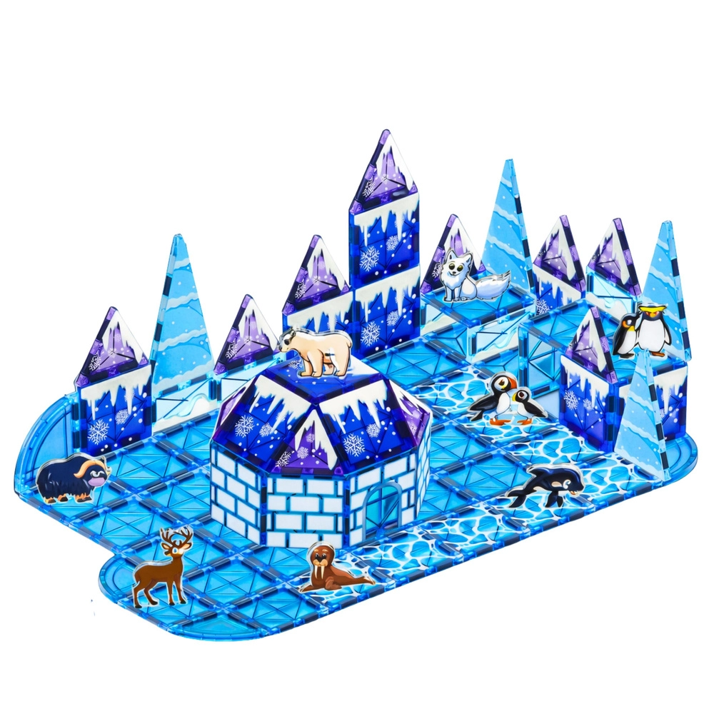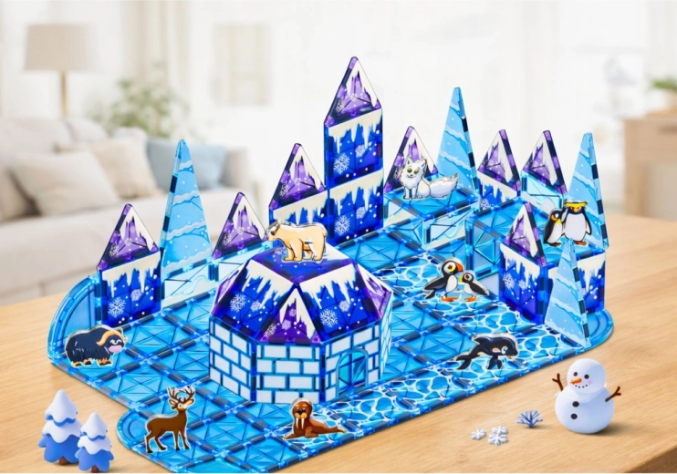 Scopri la magia del mondo invernale con un set creativo di tessere magnetiche in tonalità blu traslucide. Con 94 pezzi i bambini costruiscono igloo, torri e ponti e, grazie alle figurine di animali polari, creano storie tutte loro. I collegamenti sono saldi, quindi costruire è facile e divertente. Il gioco sviluppa creatività, spazio-visualizzazione e motricità fine.