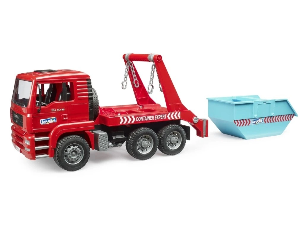Il pratico sistema a catene consente di caricare o posare facilmente il container, così il veicolo può partire subito per la prossima “commessa”. Perfetto per un gioco dinamico in cantiere.