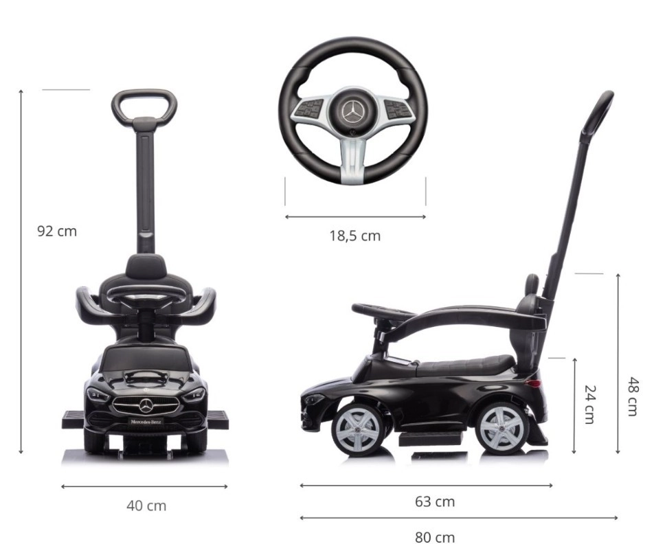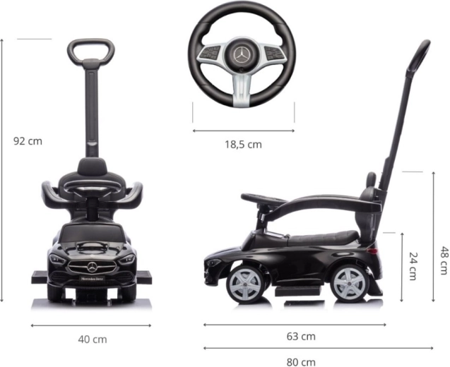 Il MERCEDES C‑Class in miniatura colpisce per i dettagli accurati – mascherina anteriore, luci ed emblemi – grazie ai quali i bambini si sentono come in una vera auto. Il monopattino combina comfort, stabilità e funzionalità: sedile morbido con schienale, protezioni laterali e pedane antiscivolo assicurano una guida tranquilla, mentre i genitori possono correggere direzione e ritmo in sicurezza tramite l’alta maniglia.