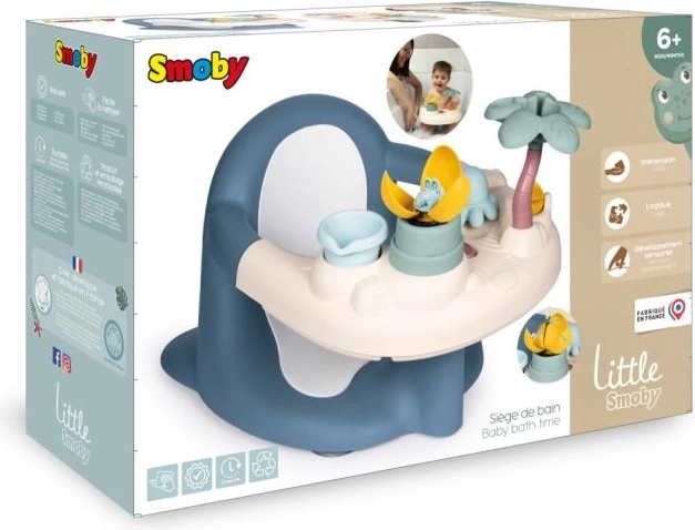 È incluso un piano giochi interattivo con 5 attività acquatiche che sviluppano i sensi e la motricità fine: mulino ad acqua, bicchierino per versare, vaporizzatore a palma, fiore “magico” e polpo che spruzza acqua. Quattro ventose robuste mantengono il sedile ben fermo sul fondo della vasca per la massima stabilità. Prodotto in Francia.