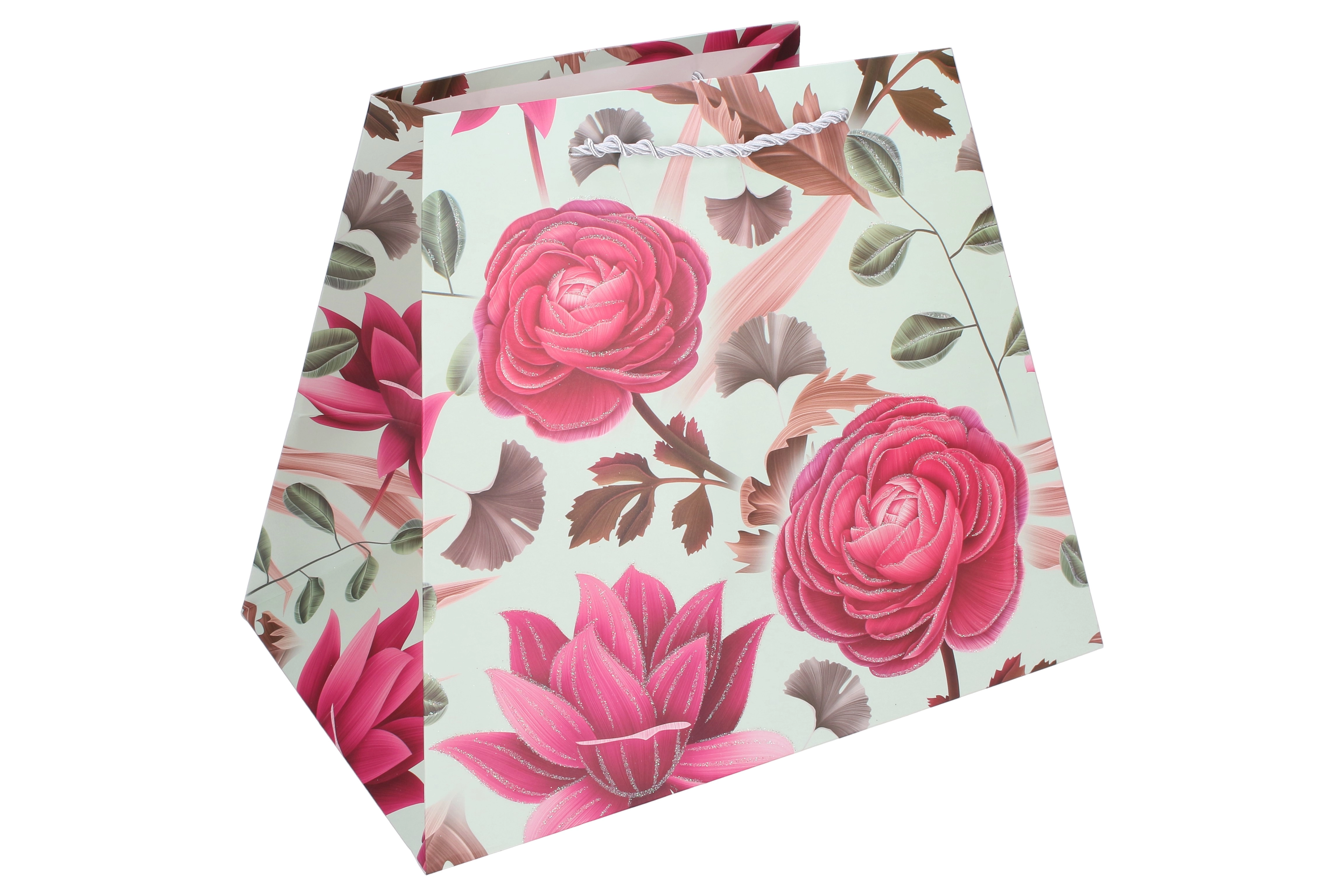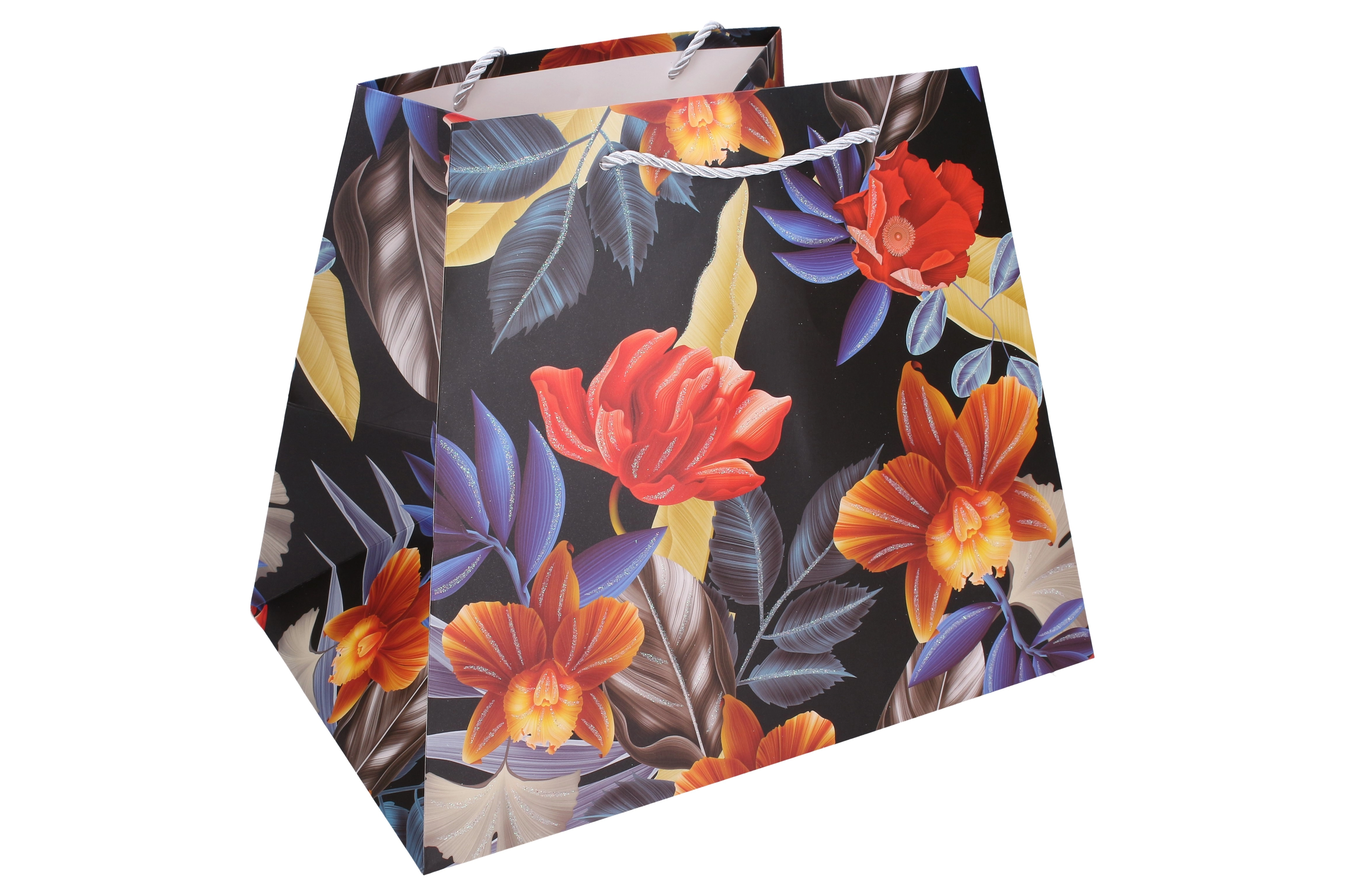Regala con stile. Questa busta regalo in carta di qualità con stampa floreale dona al tuo dono un aspetto rappresentativo. La forma stabile con fondo più ampio fa sì che la borsa resti in piedi da sola, mentre i resistenti manici in cordoncino garantiscono un trasporto confortevole e sicuro.