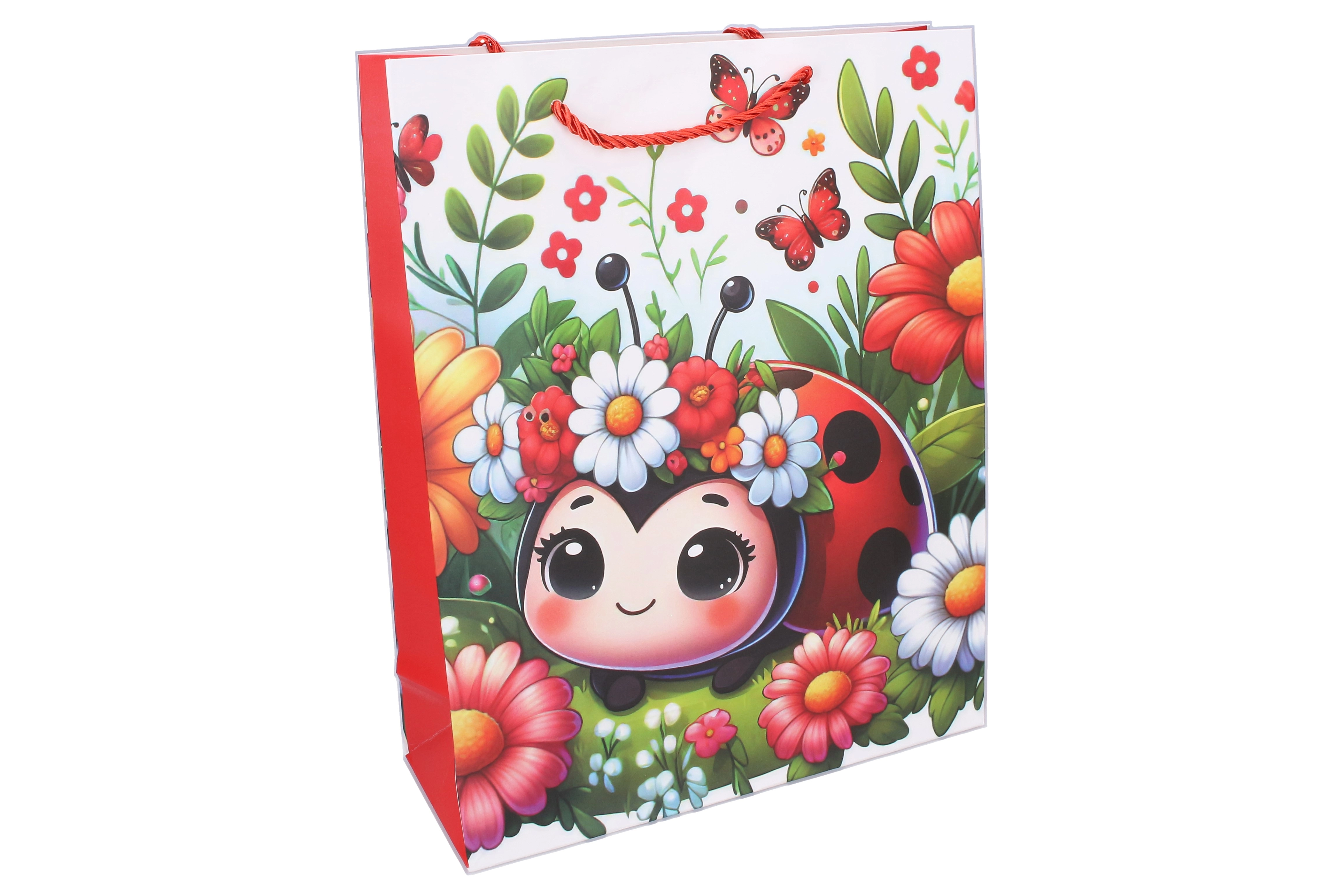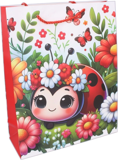 Deliziosa borsa regalo per bambini taglia M con motivo coccinella, perfetta per ogni occasione. Il pratico formato 26 × 32 × 10 cm contiene libri, giocattoli e altre sorprese, facilitando un confezionamento dei regali rapido e con stile. Disponibili 4 varianti di motivi per bambini.