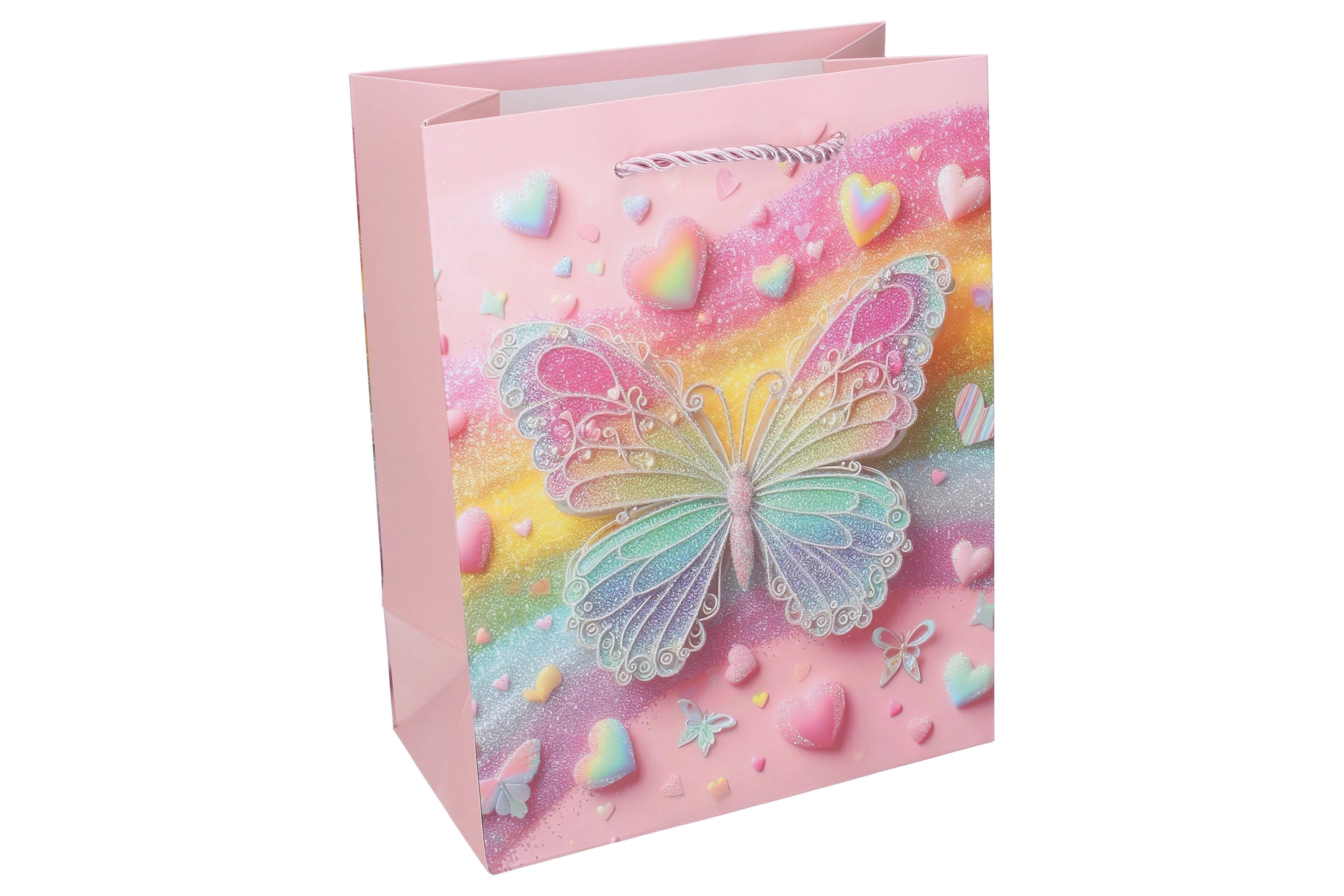 Elegante borsa regalo in carta formato S con delicati motivi di farfalle, ideale per confezionare i regali con stile. Offre manici in cordoncino ritorto robusti, dettagli lucidi e scintillanti e una struttura in carta resistente per un trasporto sicuro.