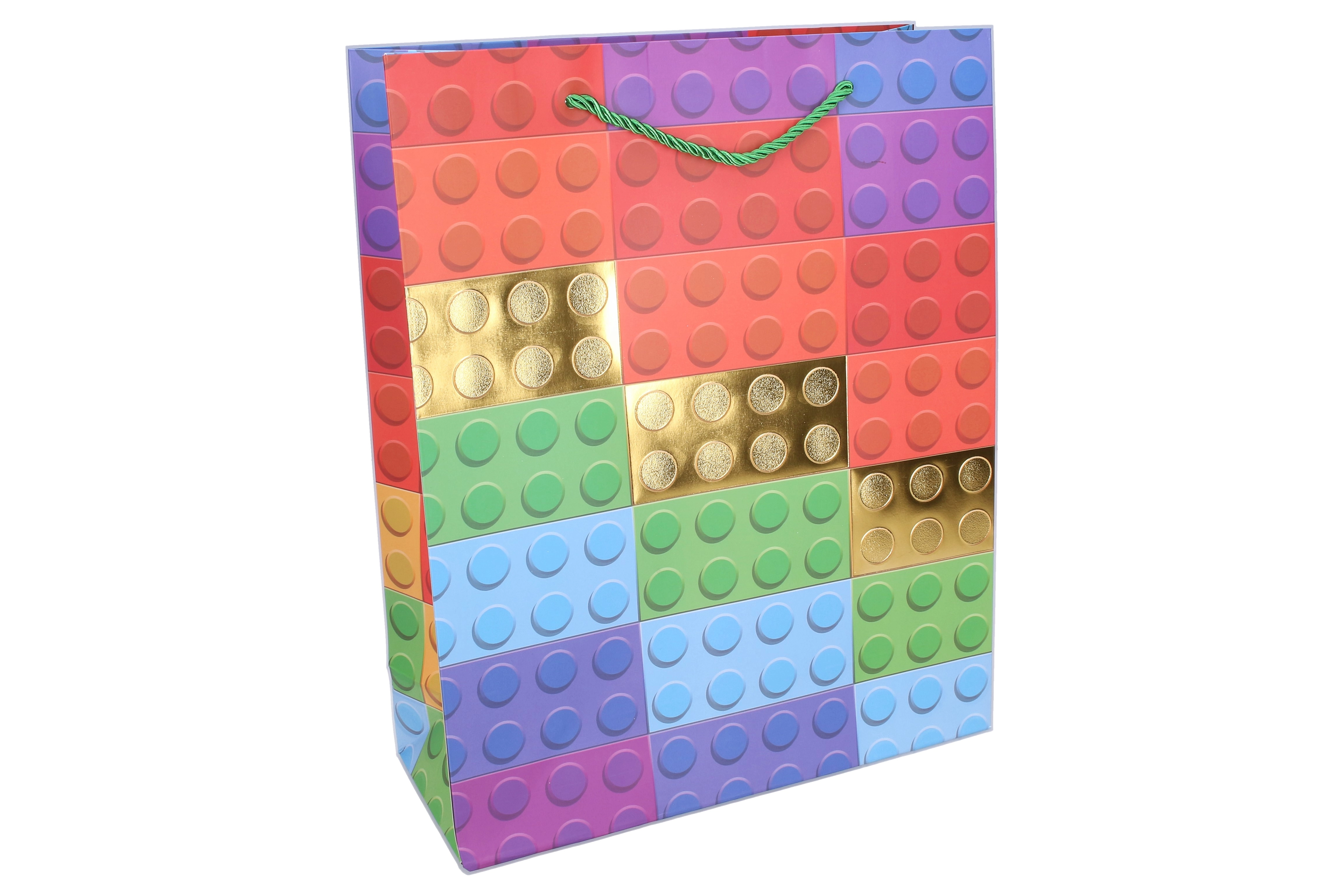 Elegante busta regalo per bambini, taglia L (31 × 40 × 12 cm) con motivo di mattoncini da costruzione che piacerà a piccoli e grandi. Offre robusti manici in cordoncino, realizzazione in carta di alta qualità e accenti dorati lucidi per un aspetto festoso. Scelta perfetta per compleanni, feste e ricorrenze.