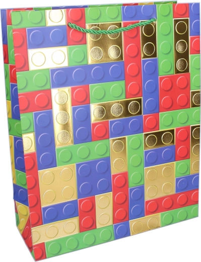 Elegante borsa regalo in formato M (26 × 32 × 10 cm) con un vivace motivo di mattoncini che farà felici bambini e adulti. Grazie alla struttura in carta resistente, ai manici in cordoncino twist e ai tocchi dorati lucidi, è ideale per un confezionamento sicuro ed elegante dei regali. Disponibile in 4 varianti di colore.