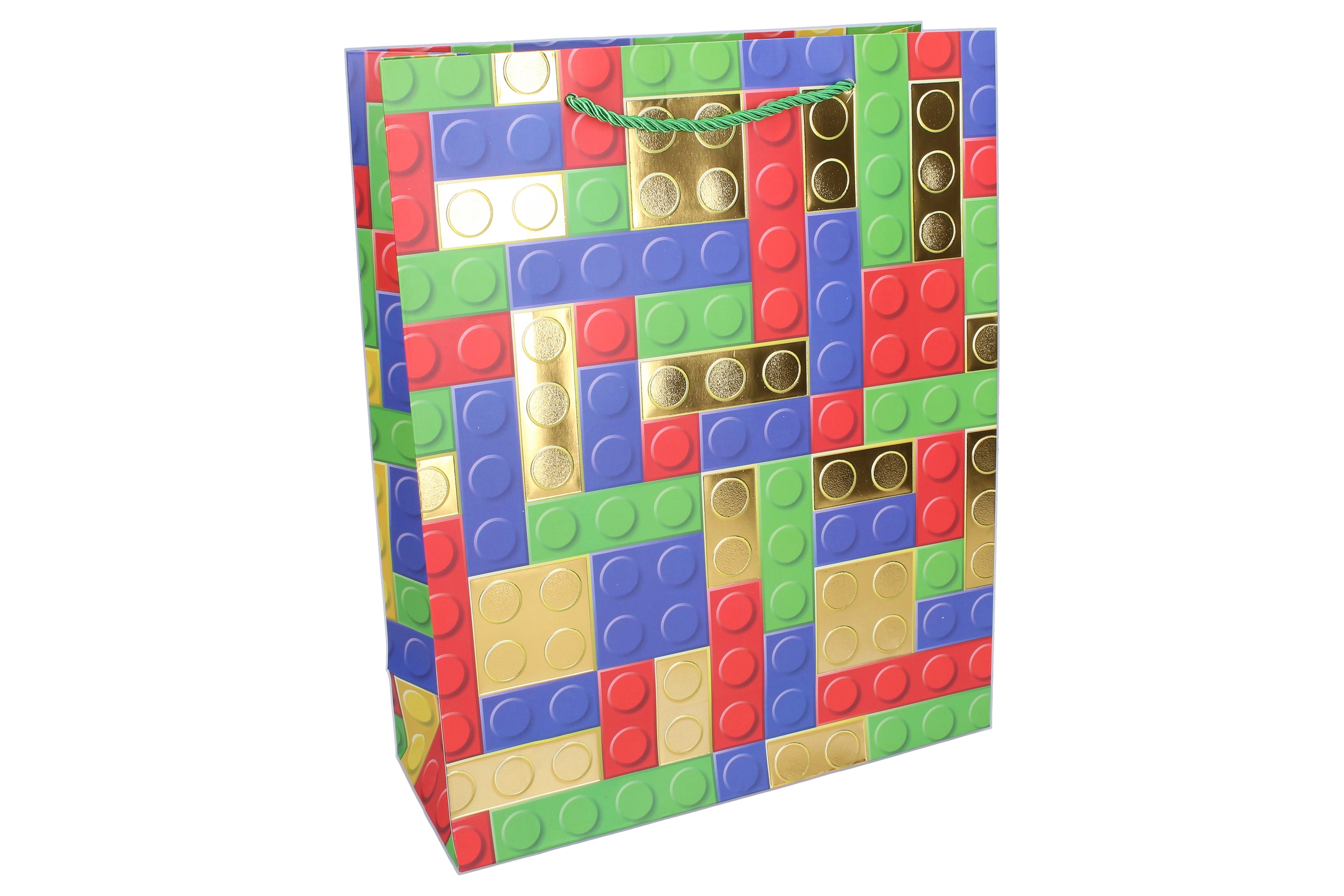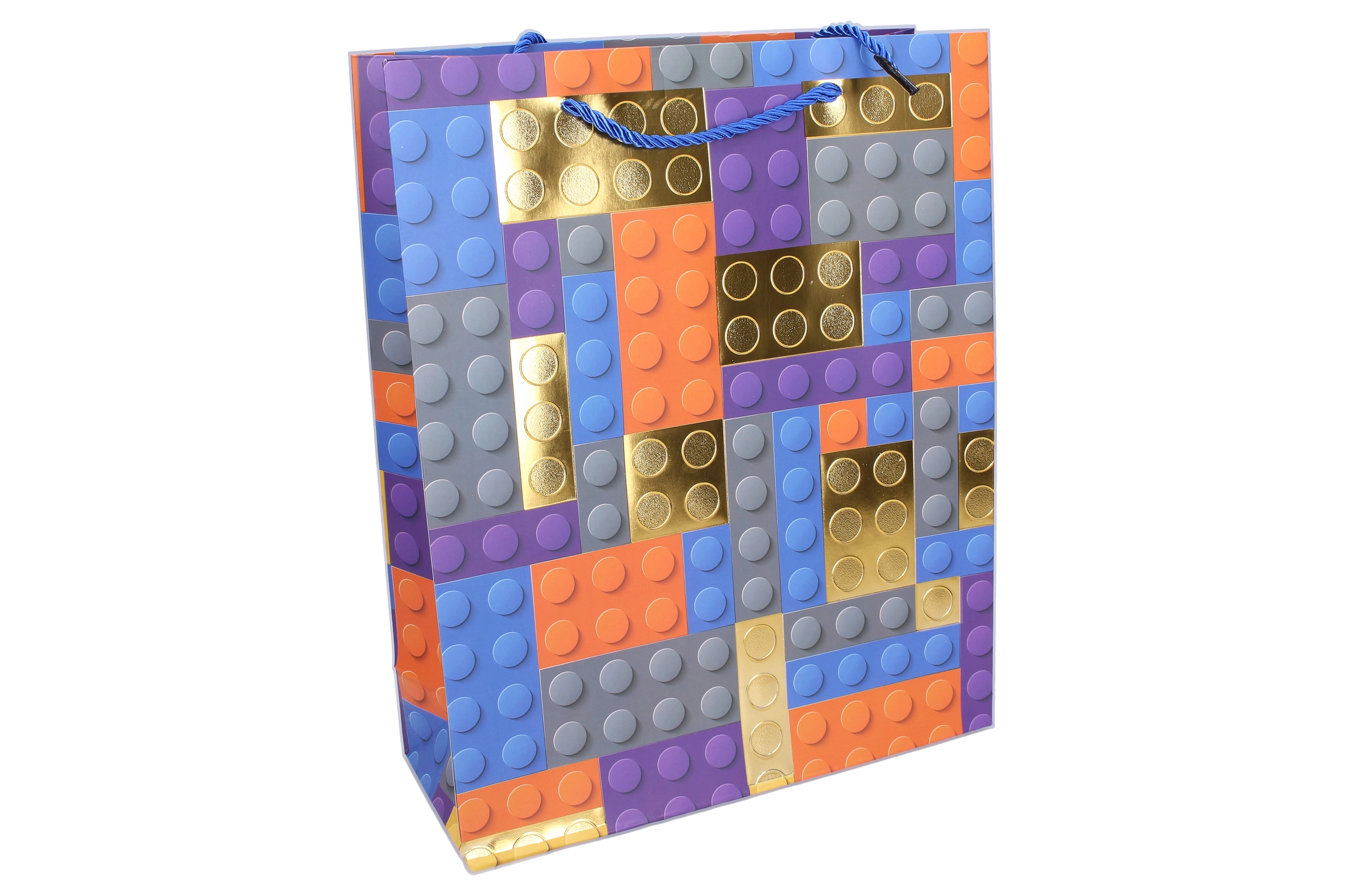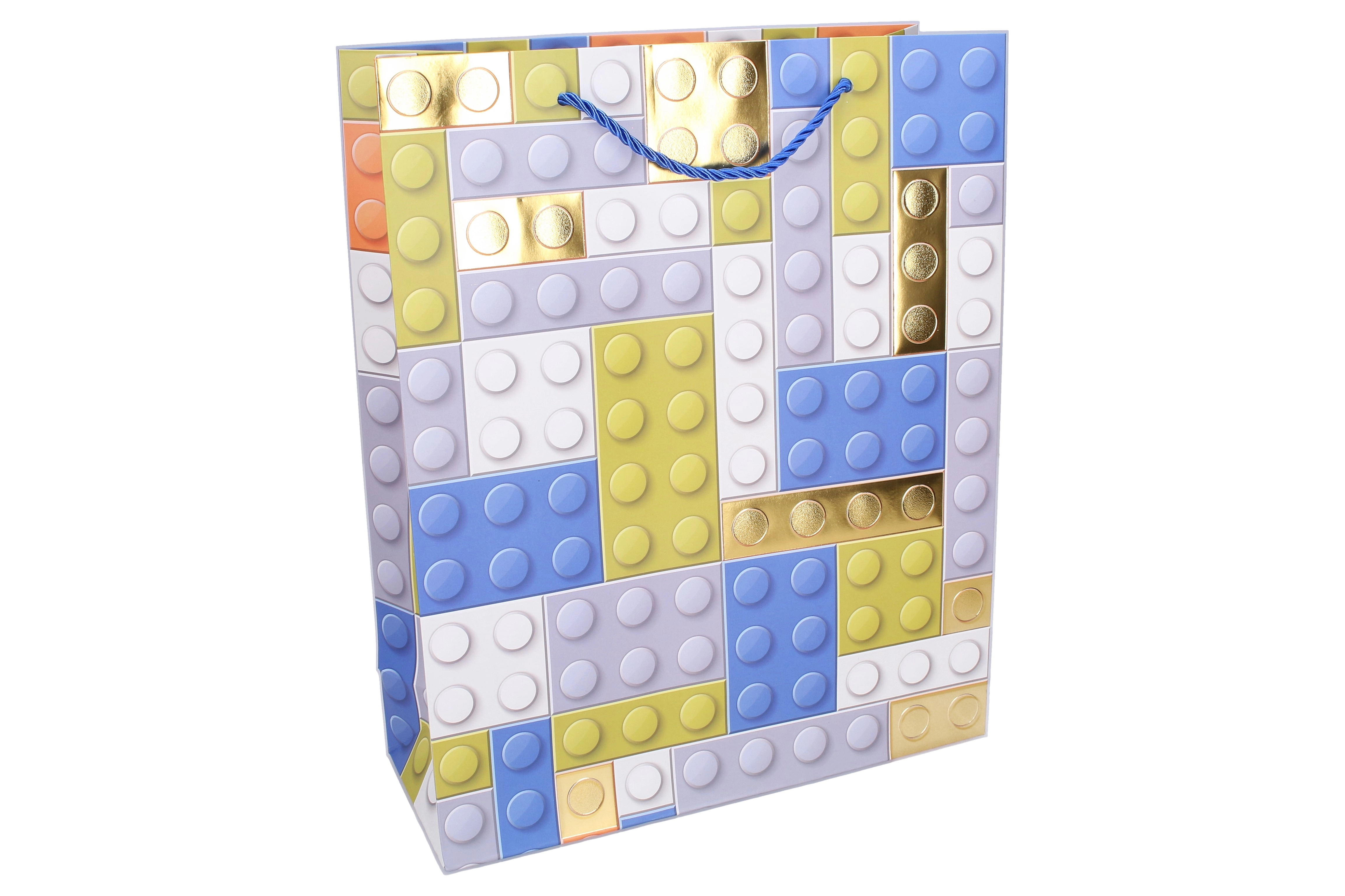 Dona al tuo regalo un tocco giocoso con questa busta regalo di qualità in formato S (18 × 24 × 8,5 cm). Si distingue per la stampa moderna che richiama i mattoncini da costruzione, arricchita da elementi dorati metallizzati dall’effetto festoso e accattivante.