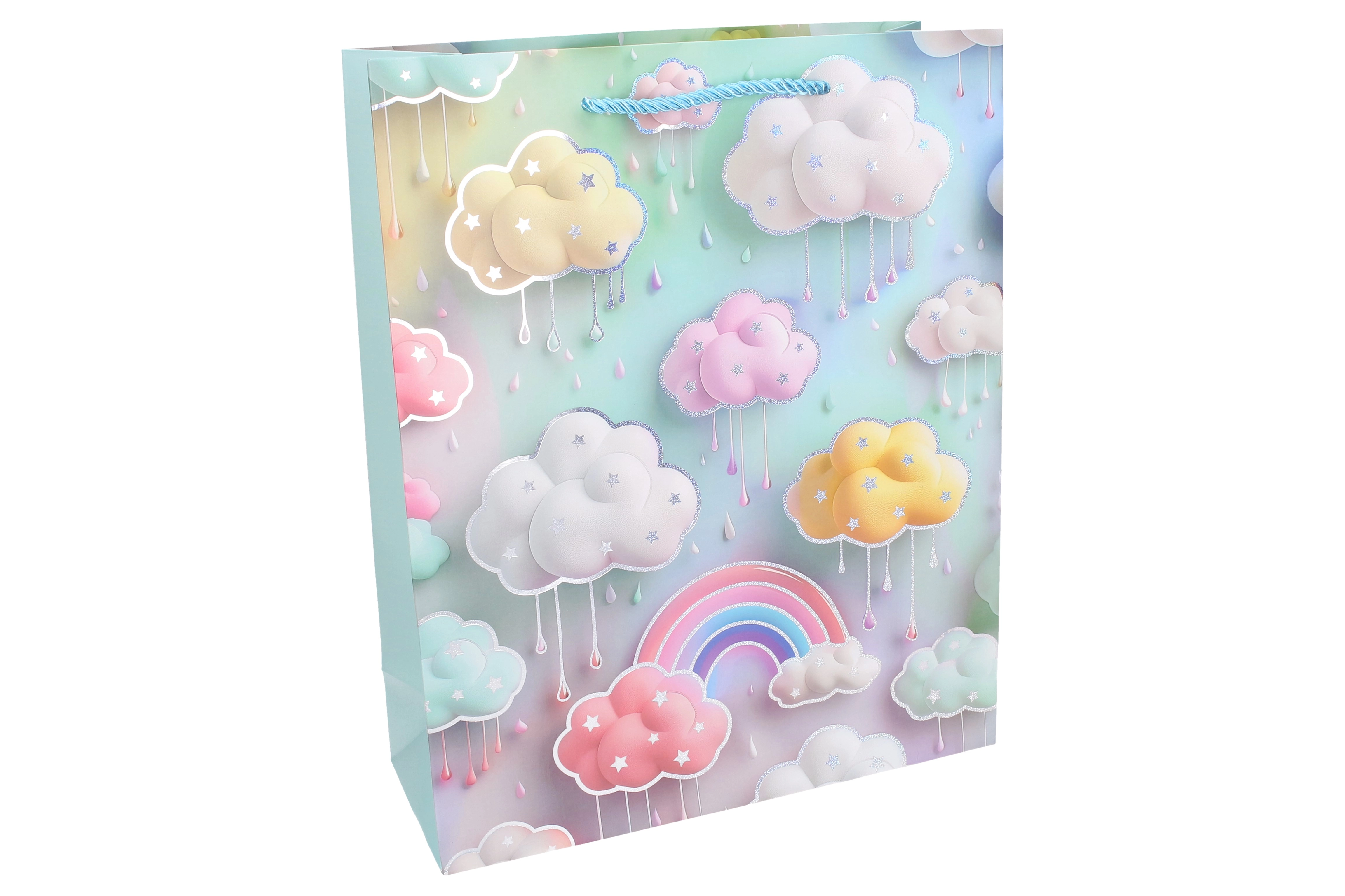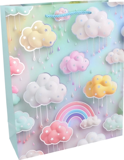 Questa borsa regalo per bambini con arcobaleno e nuvolette in tonalità pastello trasforma ogni dono in una sorpresa incantevole. Grazie alla robusta struttura in carta e alle alette laterali rinforzate sostiene in sicurezza oggetti più leggeri, giocattoli o piccoli set. L’elegante manico in cordoncino ritorto garantisce un trasporto confortevole.