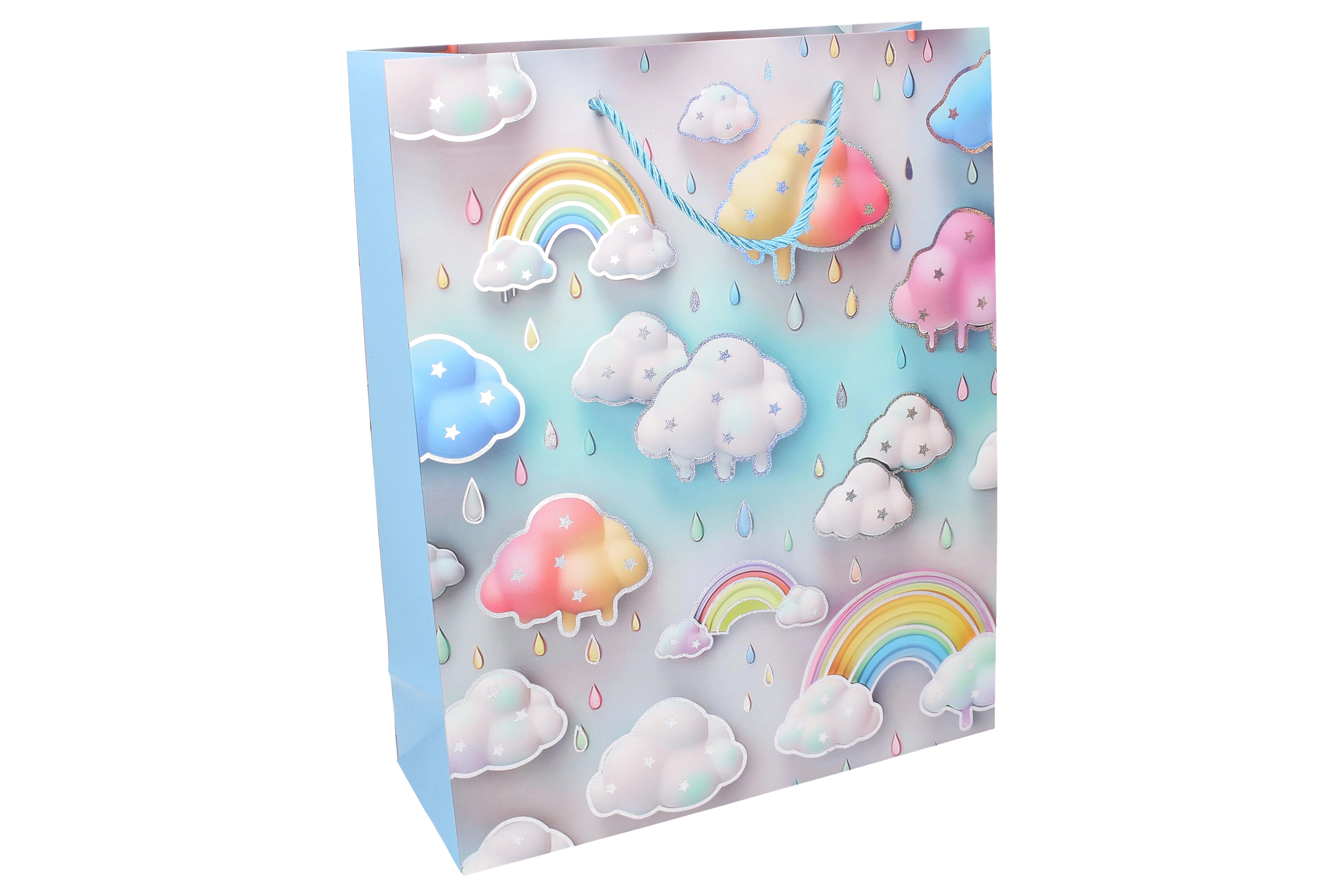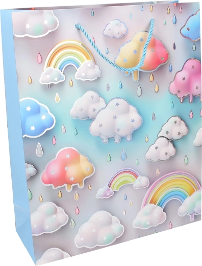 L’arcobaleno pastello, le nuvolette e le gocce creano un look delicato e giocoso che farà felice ogni bambino e valorizzerà il tuo regalo.