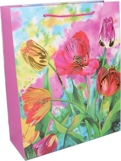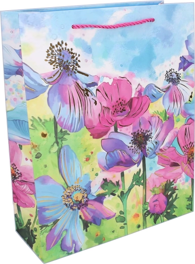 Elegante borsa regalo misura M con dimensioni 26 × 32 × 10 cm e motivi floreali, ideale per i regali tutto l’anno. Presenta una finitura lucida, un manico in cordoncino robusto e una struttura in carta resistente per una consegna dei doni sicura e con stile. Disponibili 4 varianti accattivanti con stampa floreale.