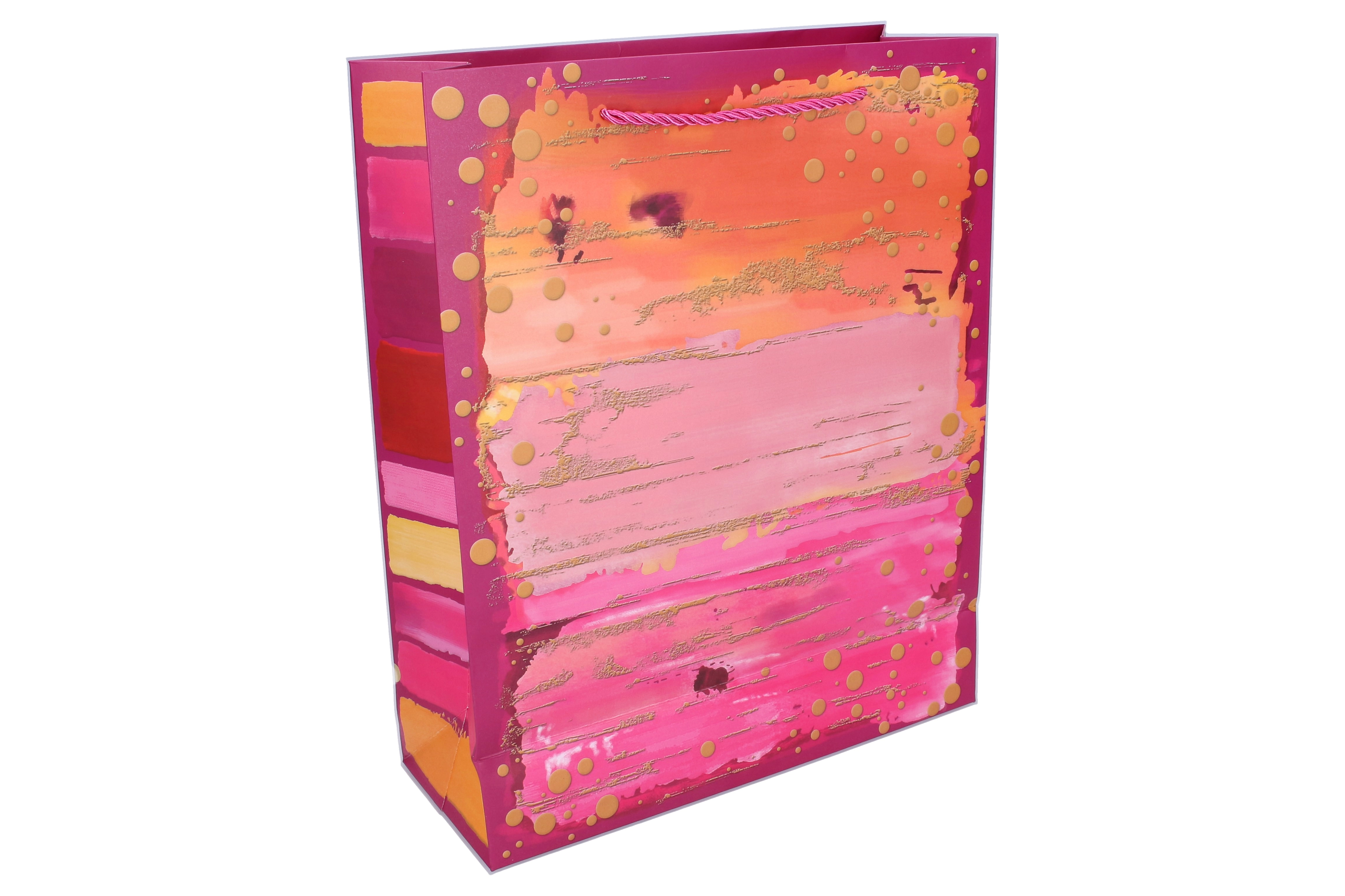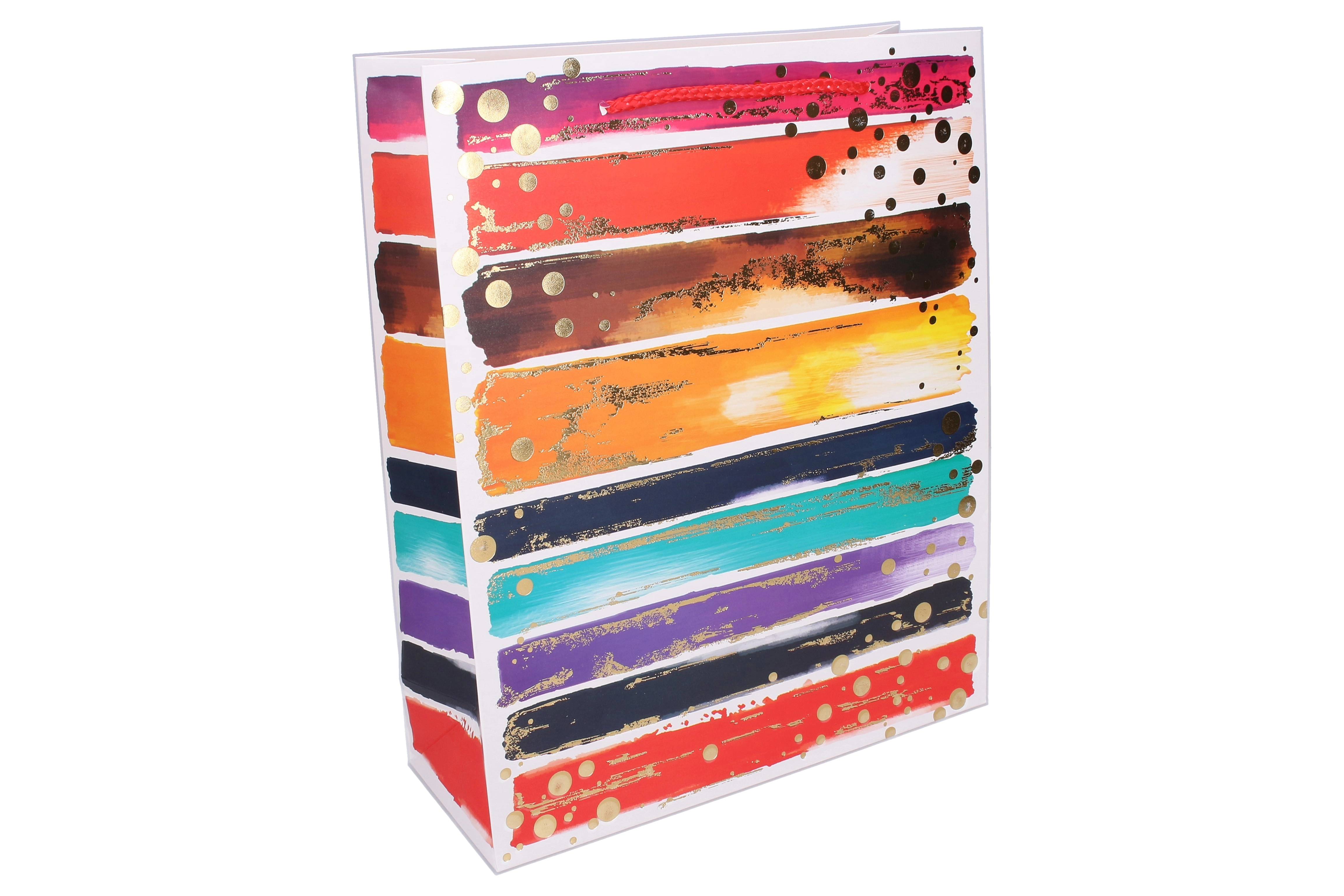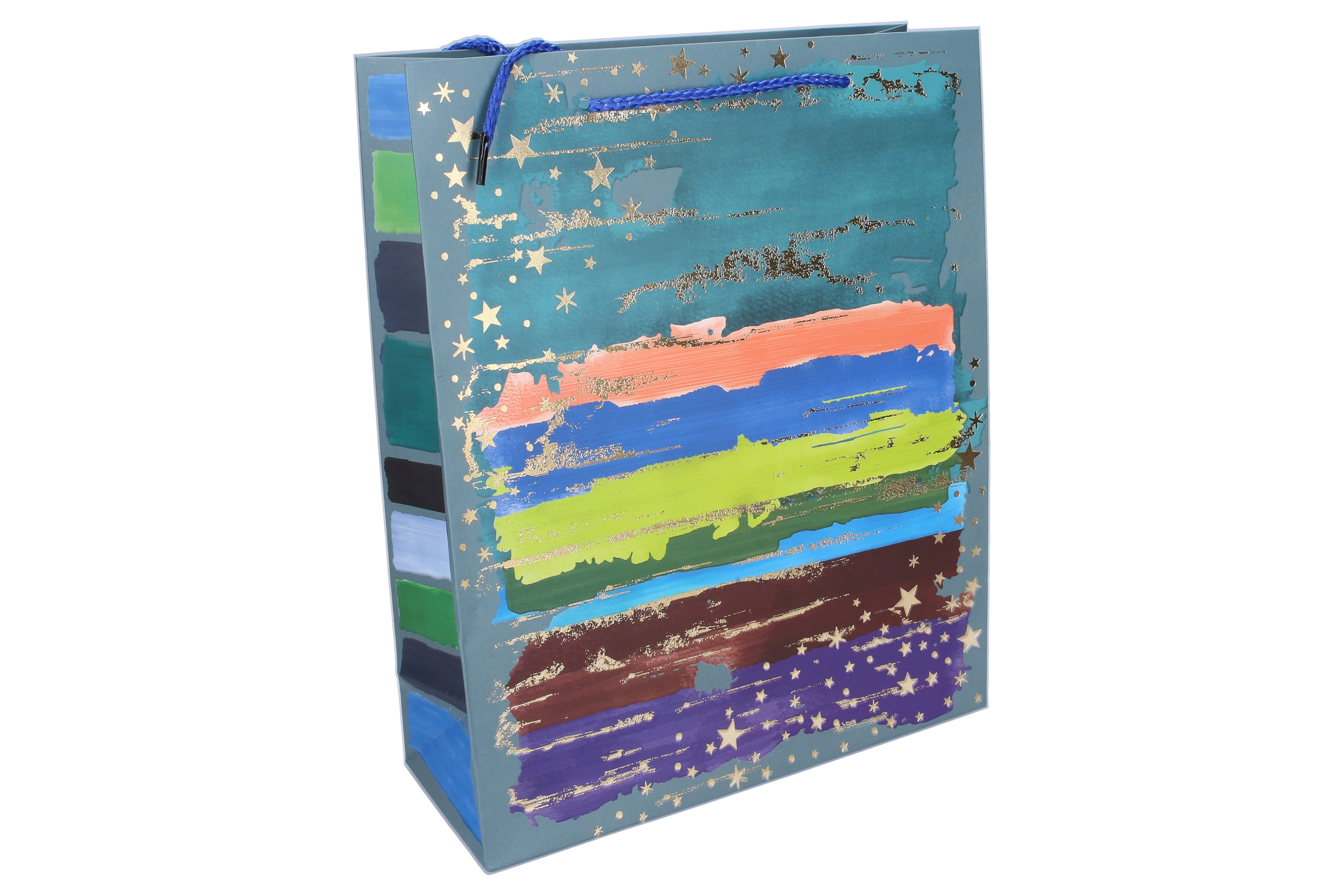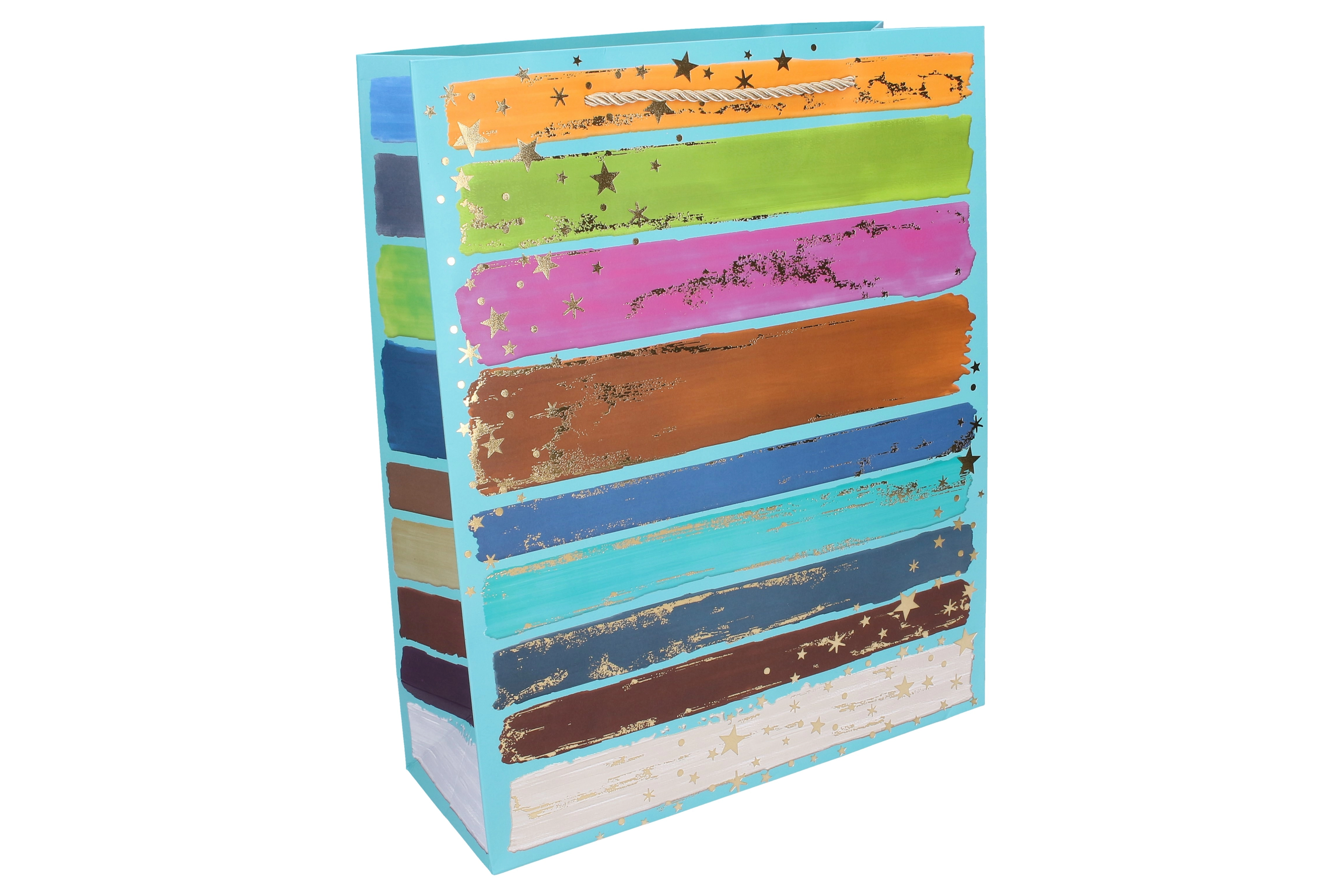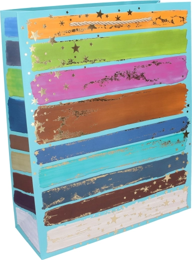Dai un tocco di stile ai tuoi regali con la spaziosa borsa regalo taglia L. Il design con pennellate vivaci, righe e dettagli dorati ha un aspetto moderno e festoso tutto l’anno. Grazie ai manici robusti e ai soffietti laterali rinforzati, trasporta comodamente regali più voluminosi, tessili, scatole o più oggetti piccoli.