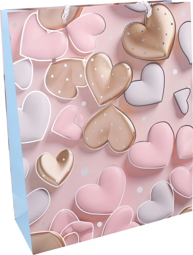 Questa elegante busta regalo di carta con cuoricini darà al tuo dono un aspetto straordinario. La stampa lucida nei toni del rosa, oro e argento e i manici in cordoncino di qualità assicurano un trasporto comodo e sicuro. Ottima scelta per compleanni, anniversari, matrimoni e regali di tutti i giorni.