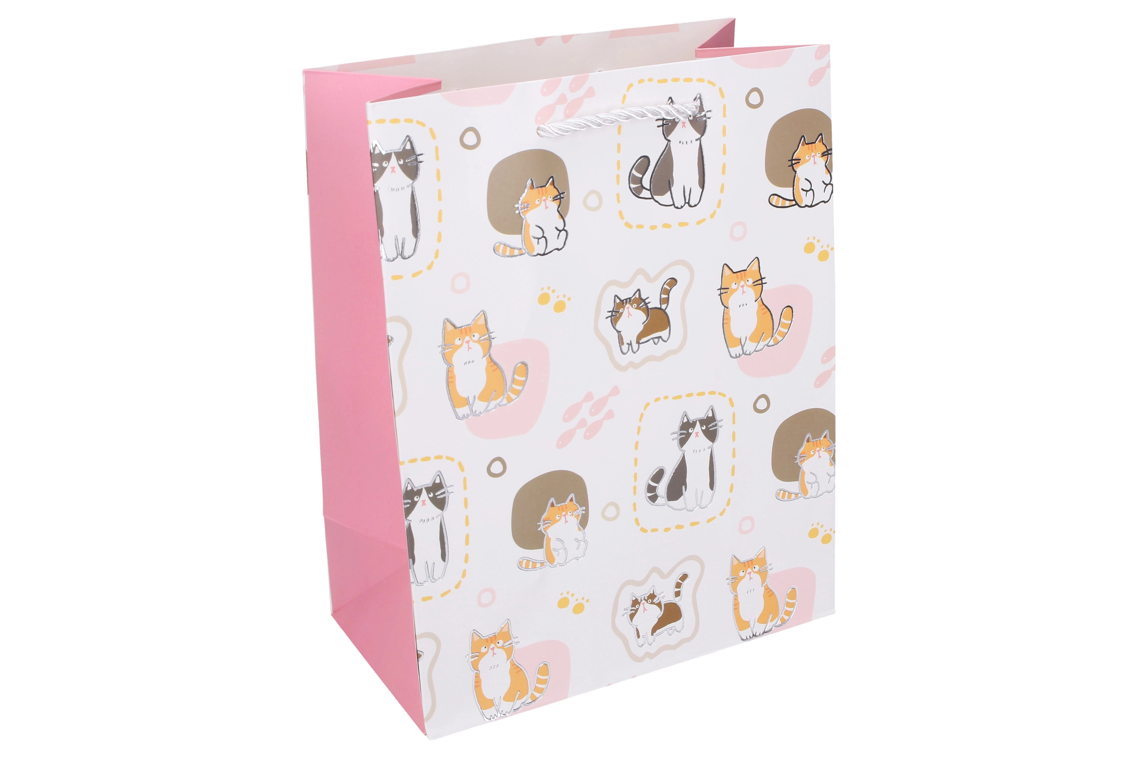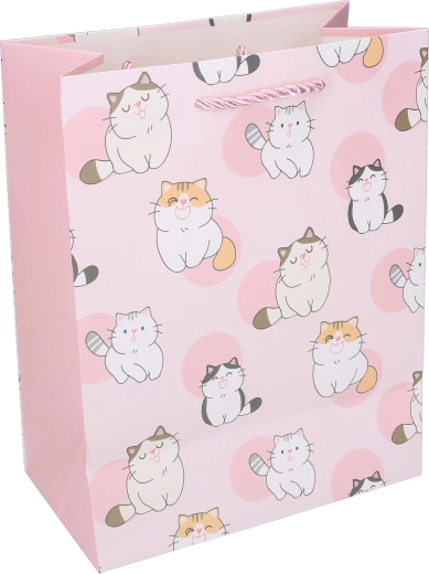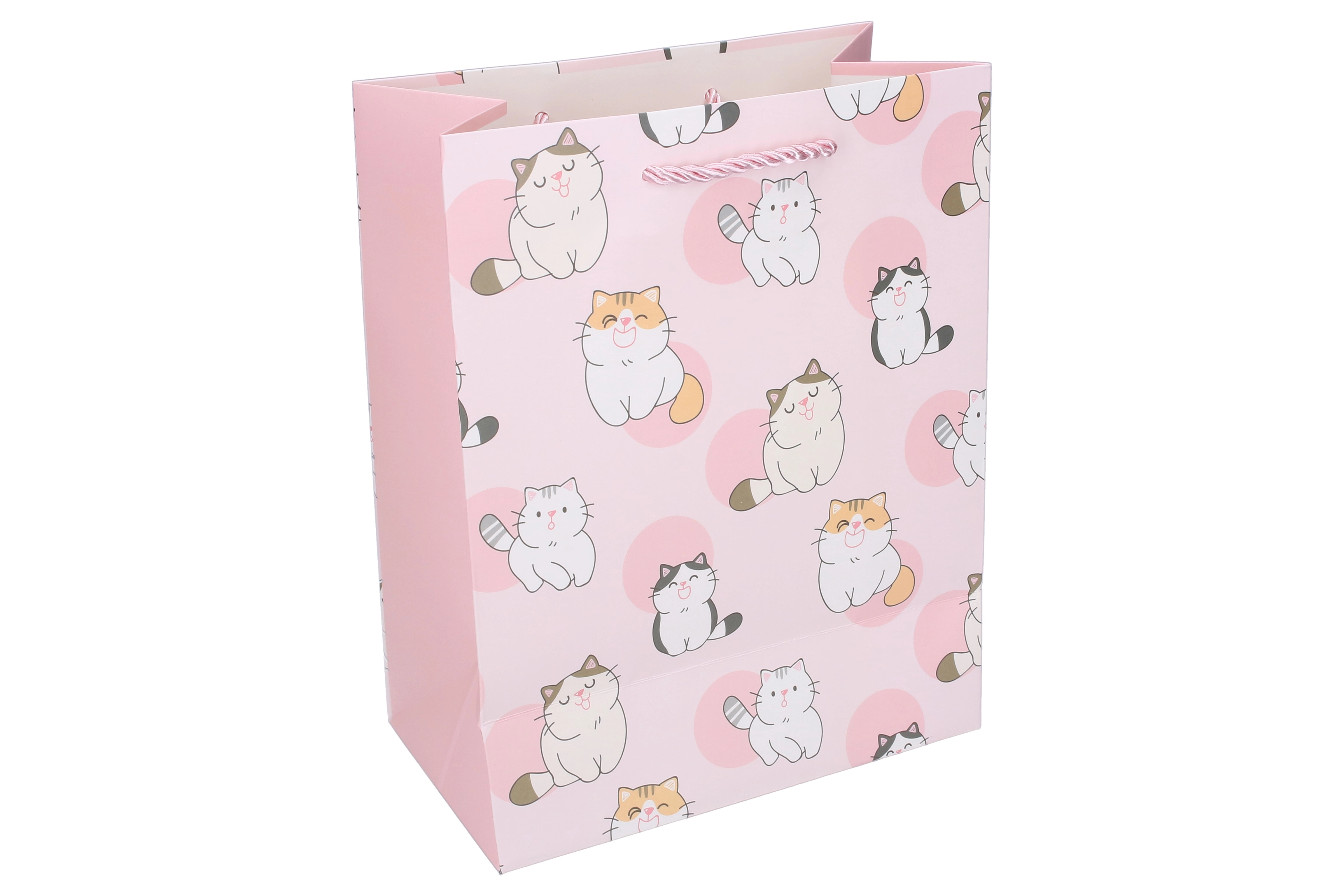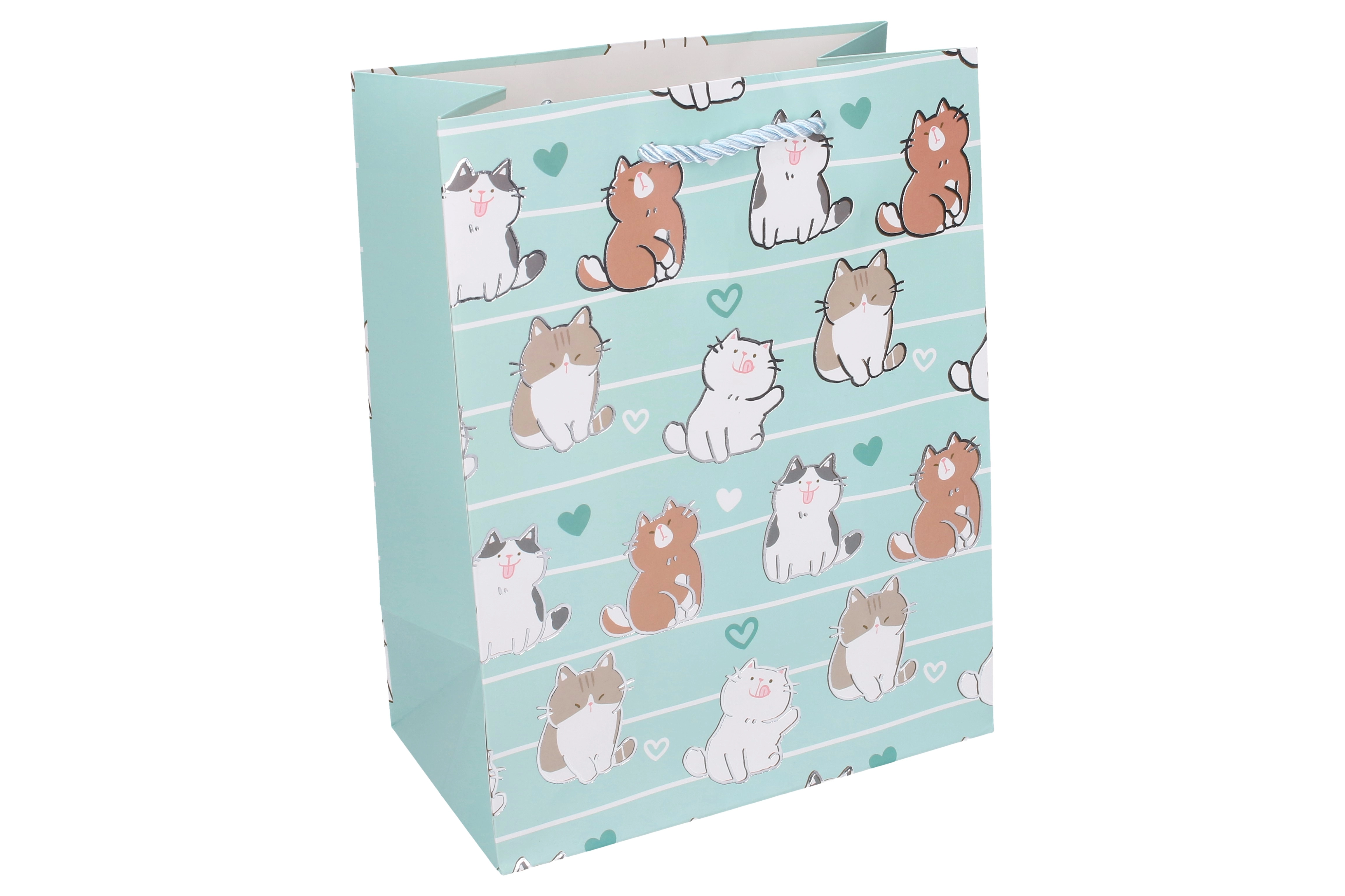 Il design con gatti in diverse varianti pastello risulta amichevole e universale. Grazie alla solida base rettangolare la busta resta in piedi da sola, si riempie con facilità e i regali rimangono ordinatamente confezionati. Un’ottima scelta quando vuoi dare al dono un effetto immediato senza carta da regalo.