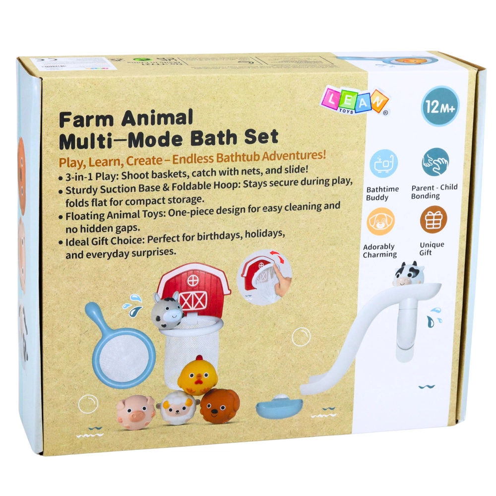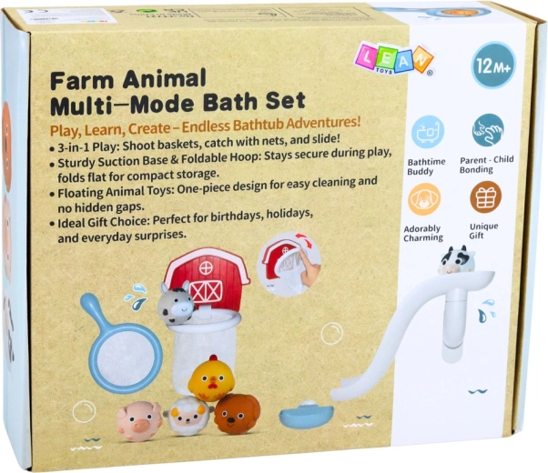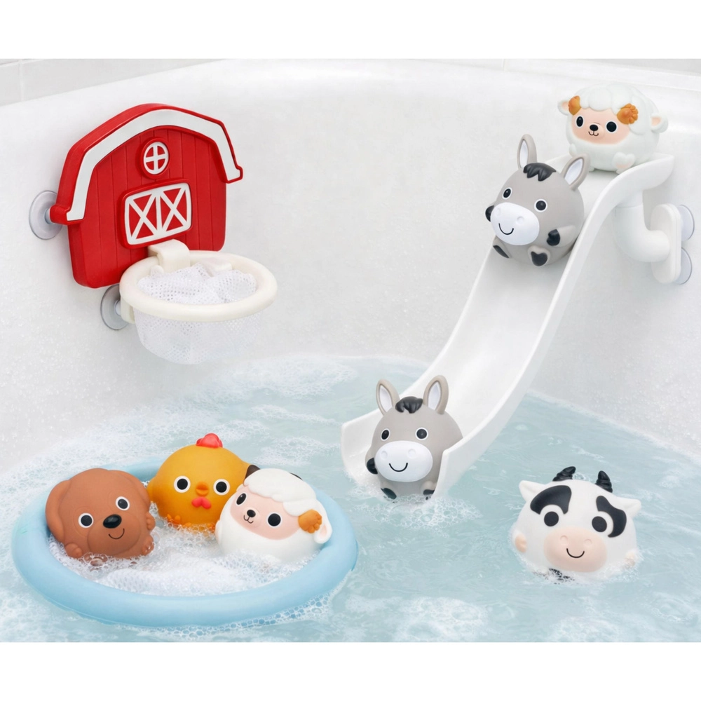 Trasformate il bagnetto in un divertimento a tema fattoria! I bambini adoreranno lo scivolo per gli animaletti, il cestino con retina per acchiappare e gli animaletti spruzzini e da schiacciare, che galleggiano sull’acqua. I pezzi si fissano facilmente alle superfici lisce grazie alle ventose e i materiali morbidi e sicuri sono adatti alle manine dei più piccoli.
