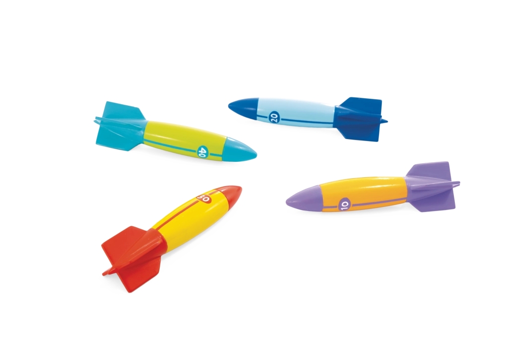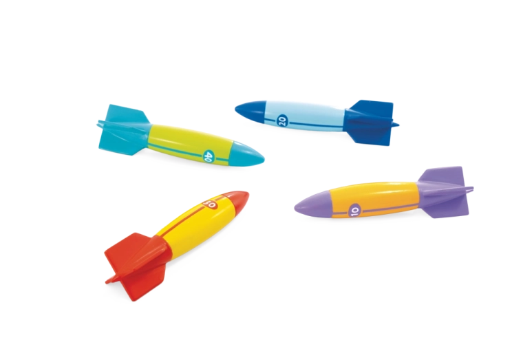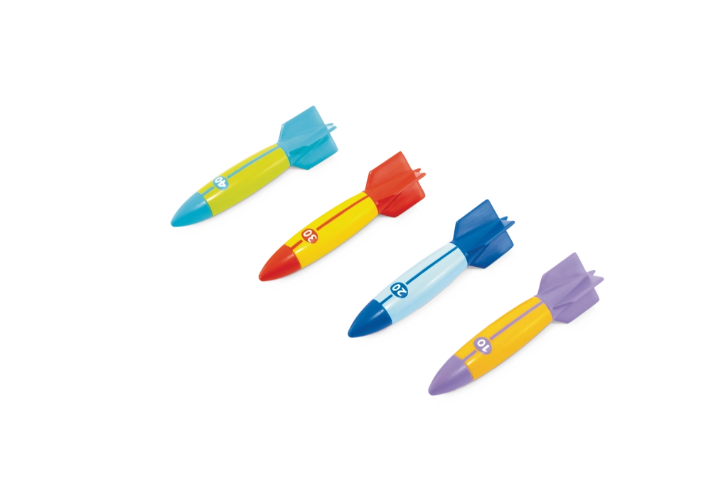 Ogni siluro presenta colori vivaci e marcatura numerica (10/20/30/40) per una facile distinzione e il punteggio. Le alette stabilizzatrici facilitano la presa e il controllo della direzione, così i bambini ottengono lanci più lunghi e precisi sott’acqua – perfetti per sfide con gli amici in piscina o allo stabilimento balneare.