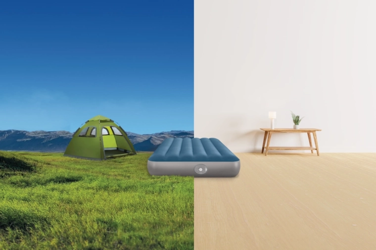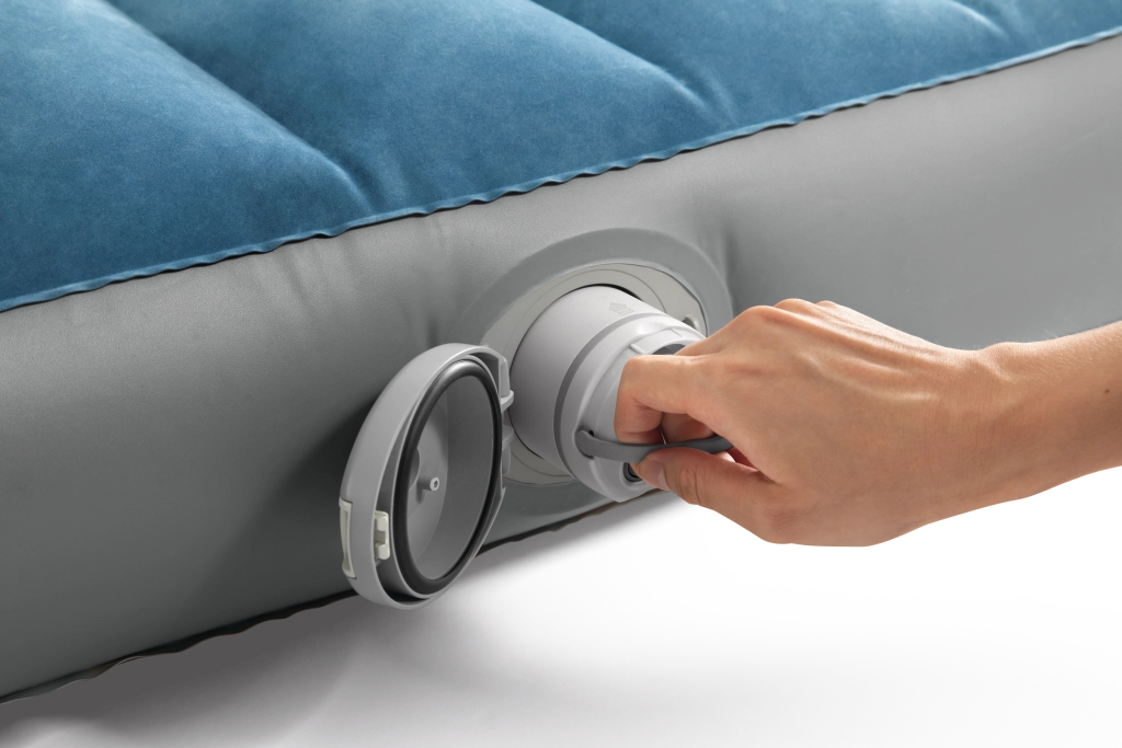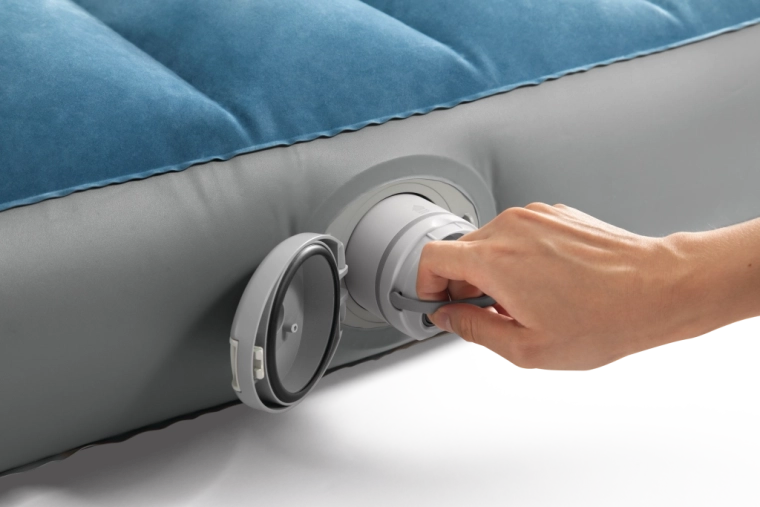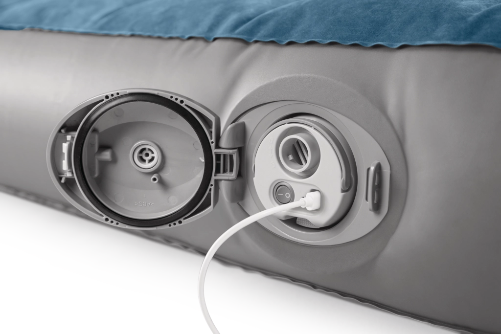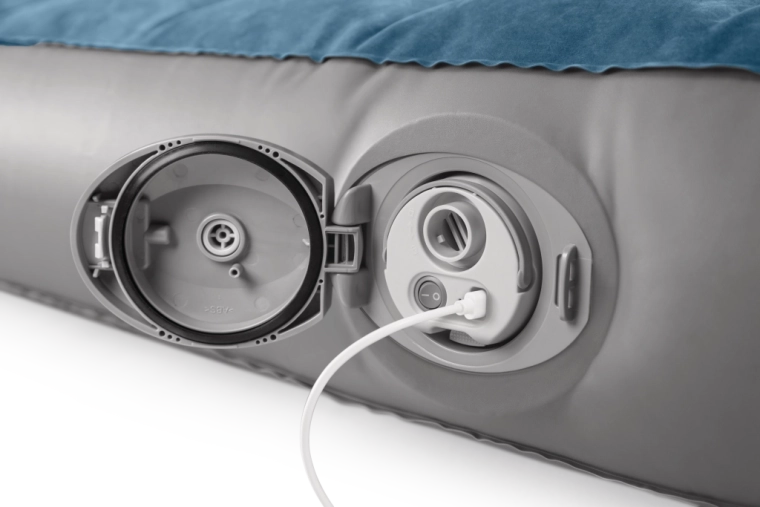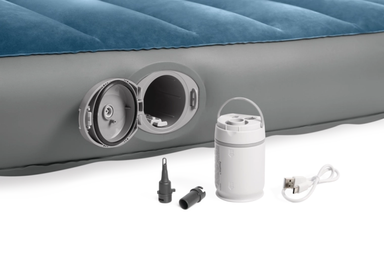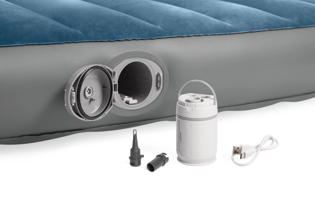 La pompa ricaricabile integrata con batteria Li‑ion si inserisce direttamente nell’alloggiamento sul lato del letto e consente gonfiaggio e sgonfiaggio rapidi. Si ricarica via USB in circa 3 ore, dispone di spegnimento automatico dopo 8 minuti e grazie a due adattatori è utilizzabile anche con altri prodotti gonfiabili. Se la batteria è scarica, il letto può essere comodamente rigonfiato tramite la valvola 2‑in‑1.