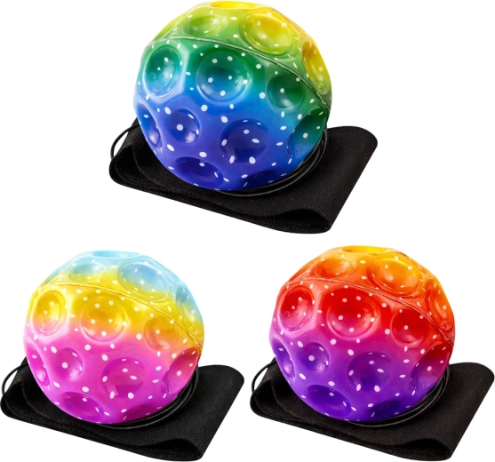 Pallina sensoriale antistress con cordino elastico e cinturino da polso che ritorna dopo ogni lancio o colpo, così i bambini non devono rincorrerla. I colori arcobaleno stimolano il movimento e la superficie a fossette massaggia piacevolmente le dita, favorendo motricità fine e concentrazione.