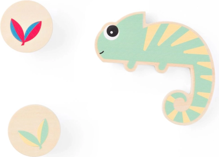 I gettoni rotondi in legno con foglie guidano i bambini al confronto e al ragionamento logico: cerca la foglia con due colori che il camaleonte non ha.