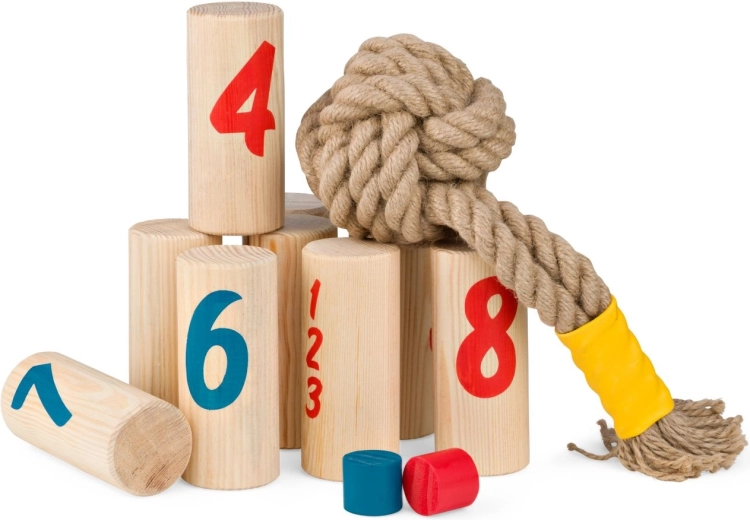 Scopri un gioco di famiglia vivace e avvincente per 2–6 giocatori dagli 8 anni in su. Con un nodo da lancio abbatti pioli di legno numerati e raccogli punti – vince chi per primo raggiunge esattamente 30 punti oppure abbatte tutti i pioli del proprio colore. Il gioco è ideale per il giardino e il parco, favorisce la motricità grossolana, il pensiero strategico e il gioco attivo all’aperto. Il legno proviene da foreste gestite responsabilmente.