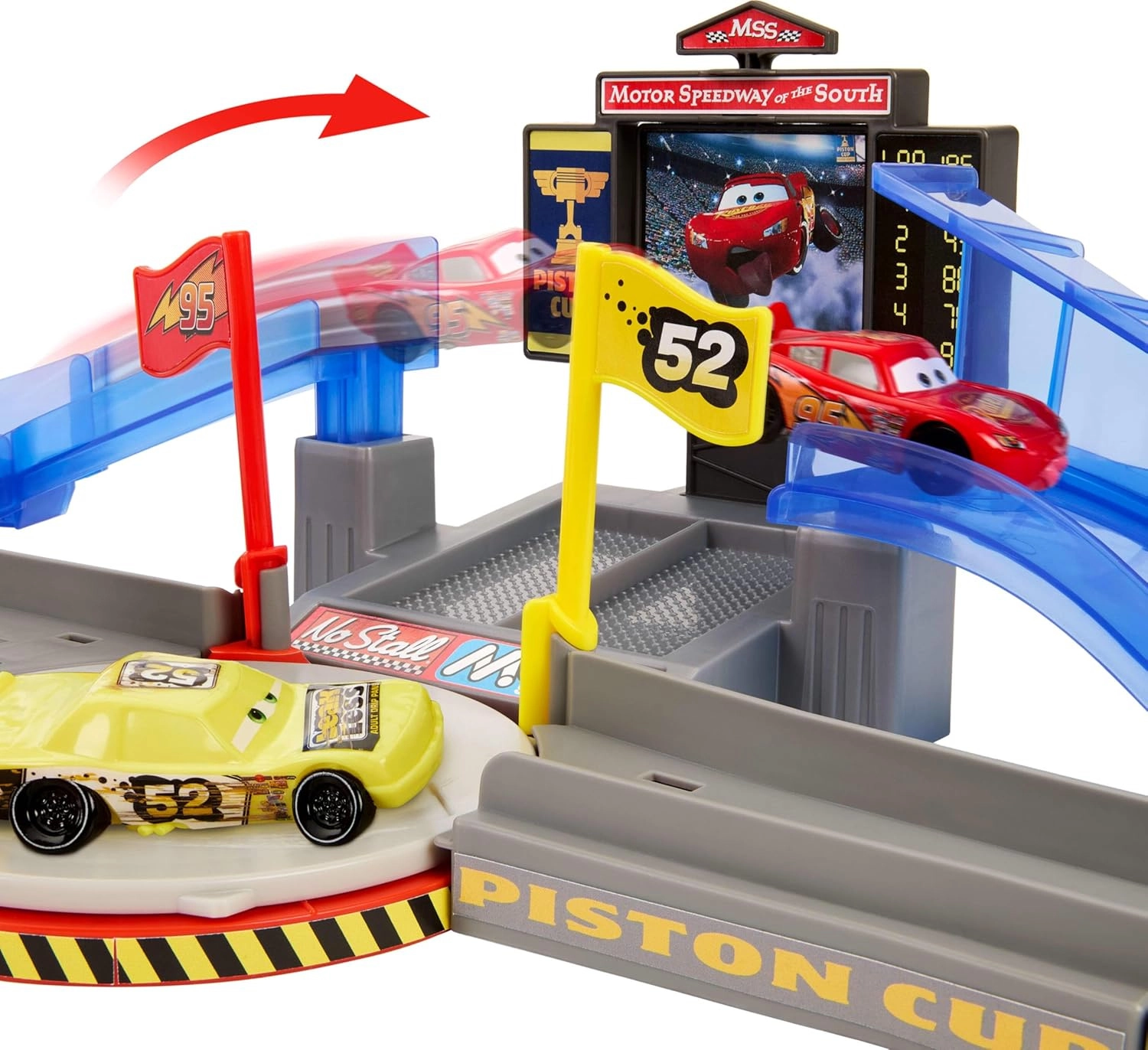 Vivi i momenti del film direttamente a casa. In modalità schianto fai ruotare il segnale giallo e prepara la zona d’impatto. Posiziona Saetta McQueen nel lanciatore e prendi la mira: un lancio corretto significa corsa fluida senza ostacoli, altrimenti avverrà una spettacolare collisione con l’auto “ammaccata”. In modalità gara sposta lo scambio, lancia sulla rampa e guarda il grandioso salto acrobatico. Lo schermo girevole proietta l’eroe sul “maxischermo” per un’emozione ancora maggiore.