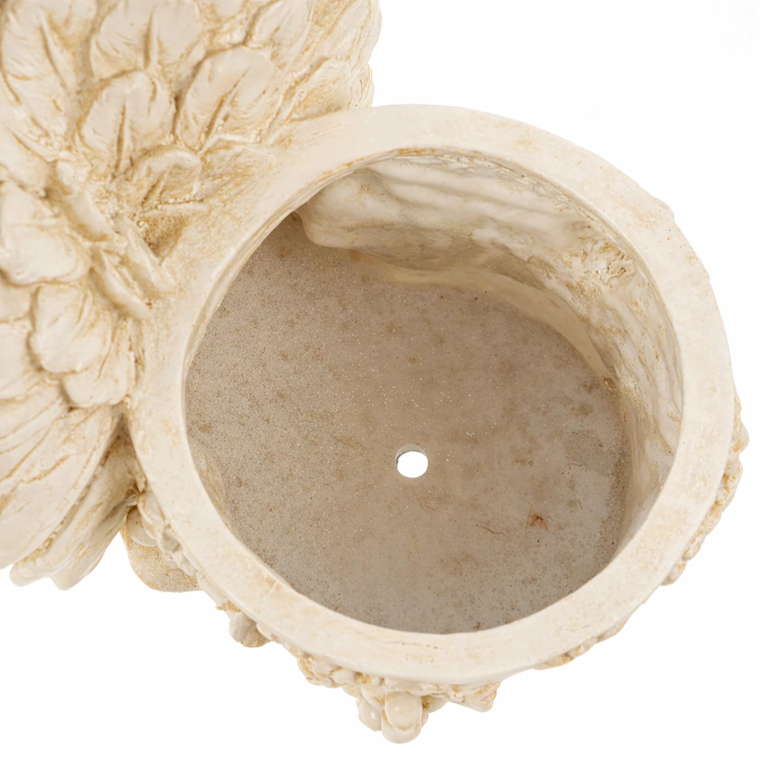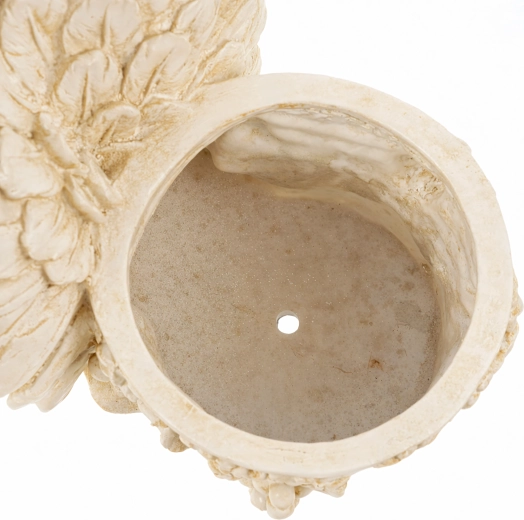 Questo elegante vaso con statuetta di un angioletto addormentato unisce il fascino della decorazione alla funzionalità di un contenitore per piante. Il corpo dell’angelo, con ali finemente lavorate, si appoggia a un vaso rotondo decorato con motivi di vite che sottolineano l’aspetto antico, effetto pietra. Perfetto per interni ed esterni – sul davanzale, balcone, terrazza o in un angolo del giardino.