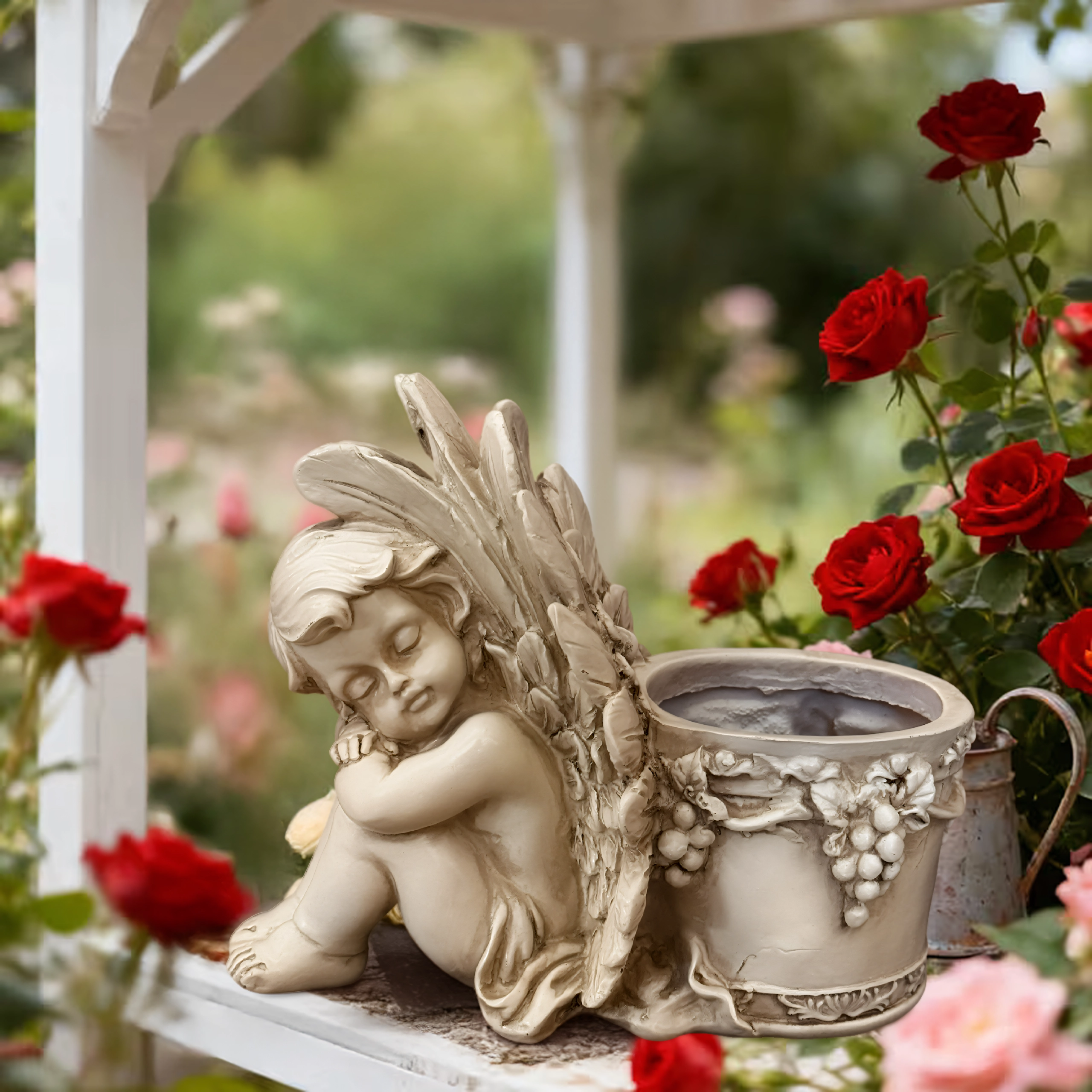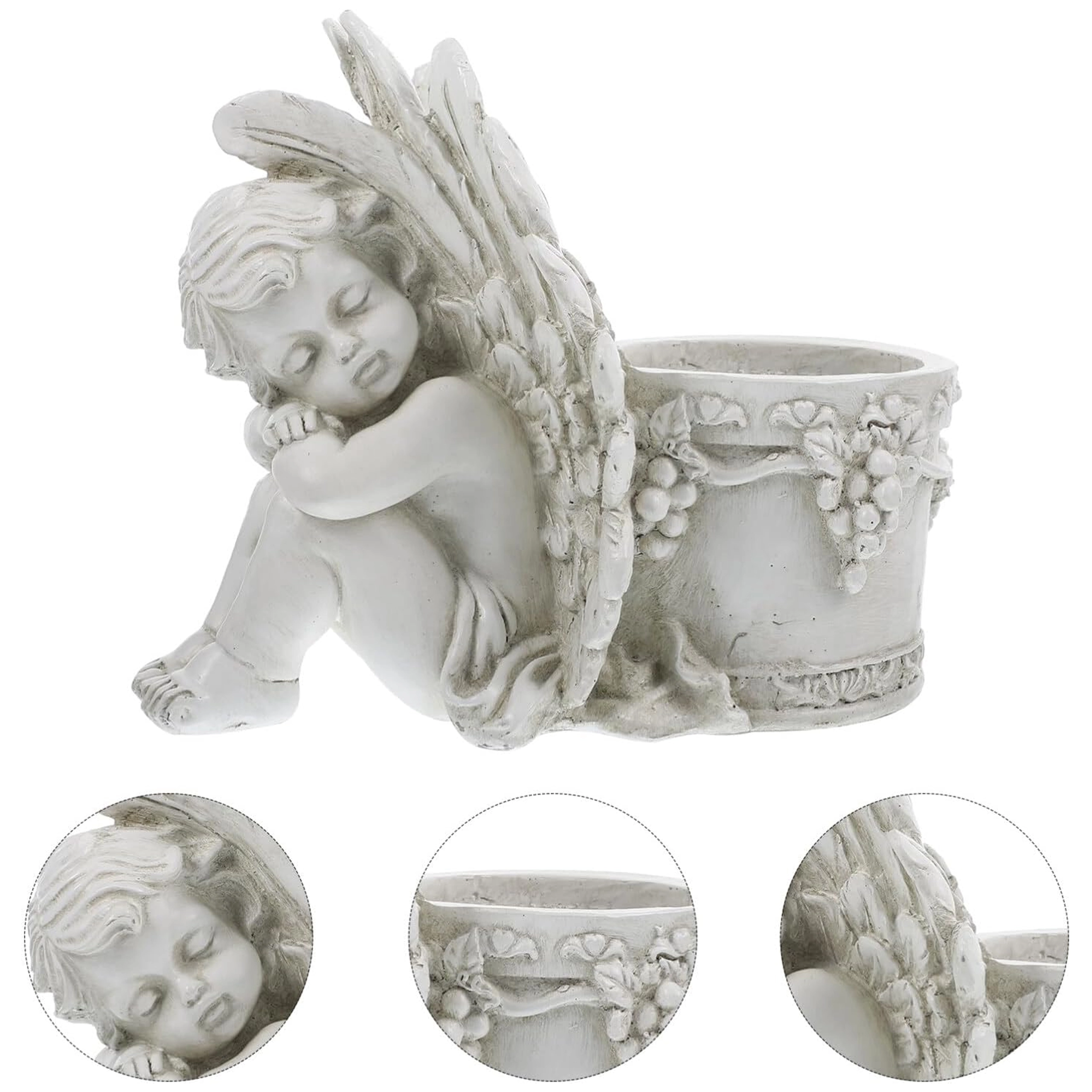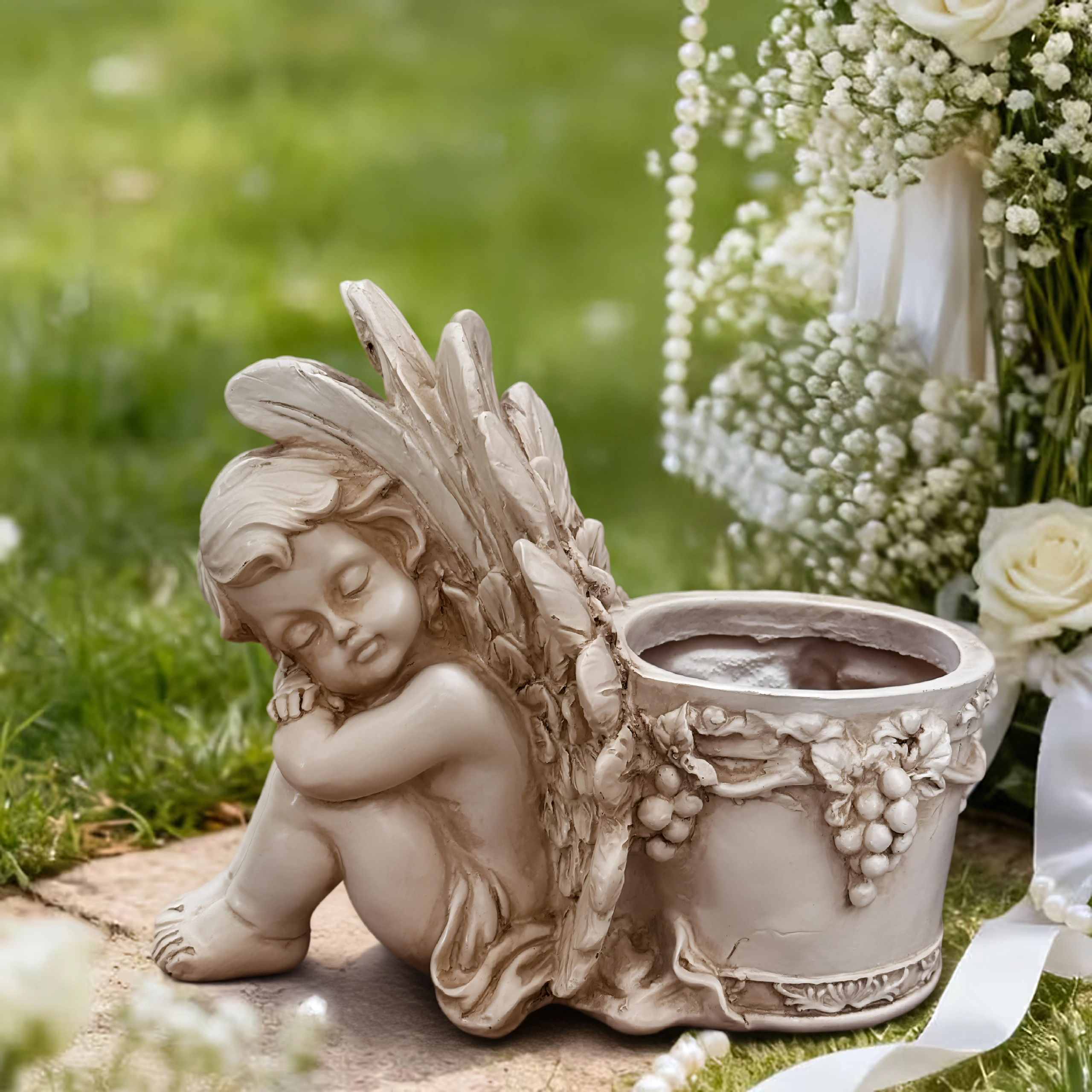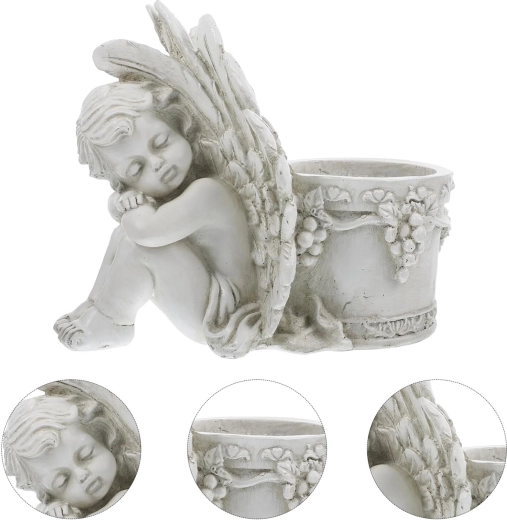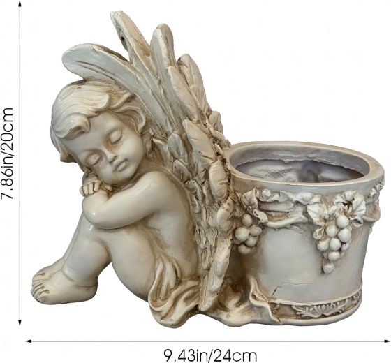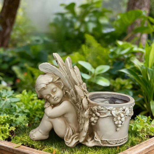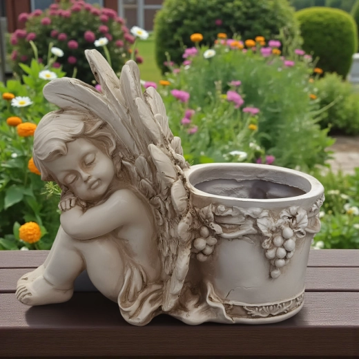 Elegante vaso decorativo con motivo dell’angioletto addormentato, perfetto in giardino e in casa. Offre lavorazione a rilievo dettagliata, aspetto vintage in pietra e spazio pratico per piante o una candela. Ideale come decorazione da giardino romantica, per erbe aromatiche e succulente e come composizione regalo.