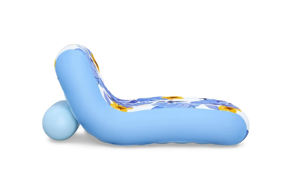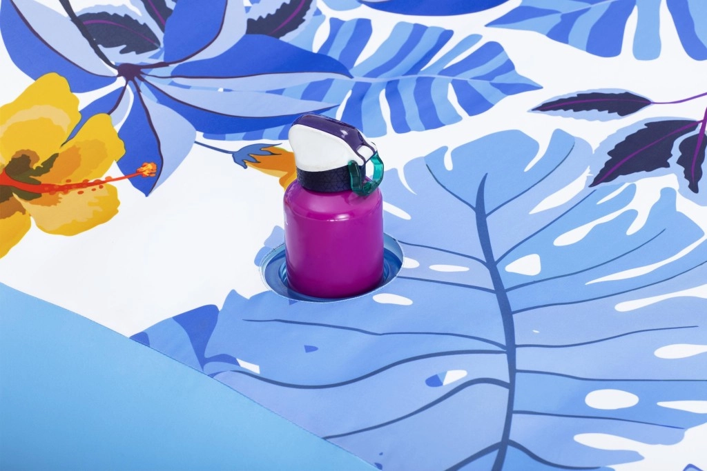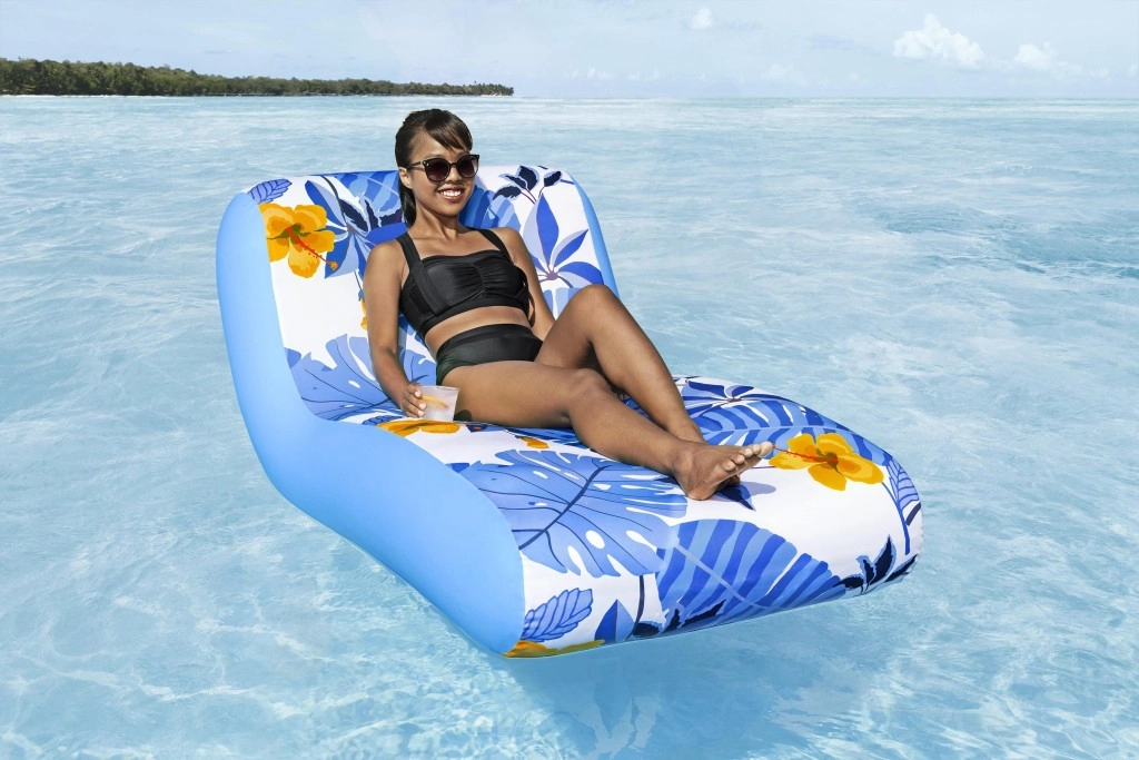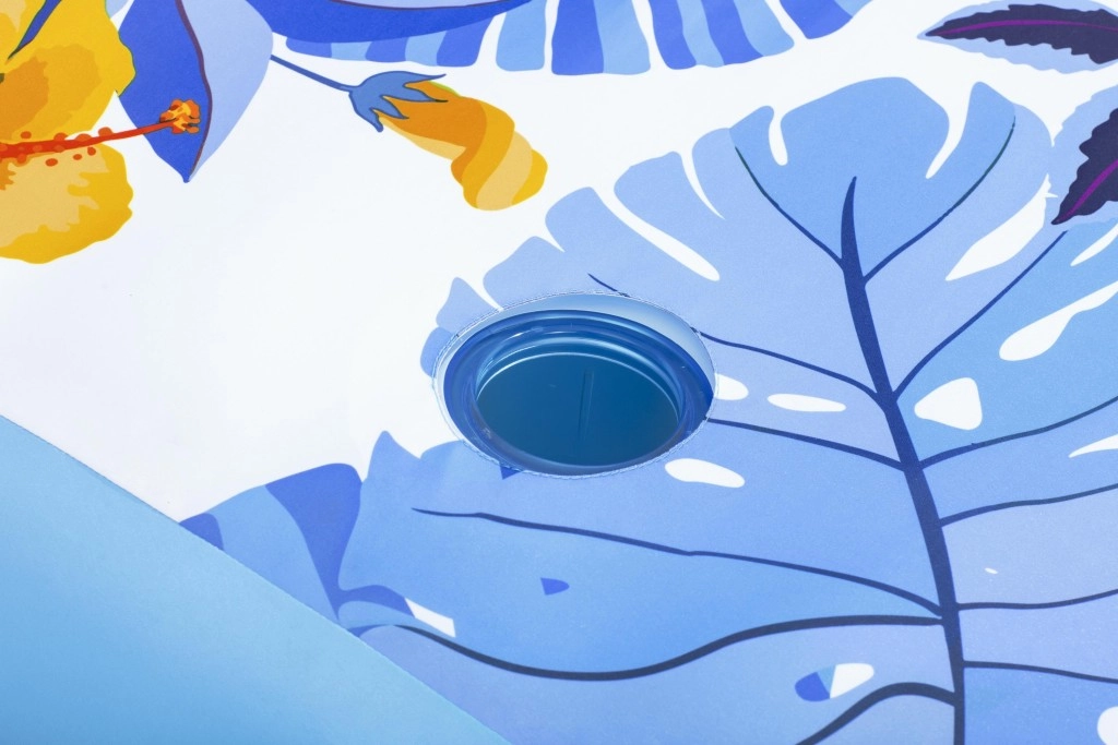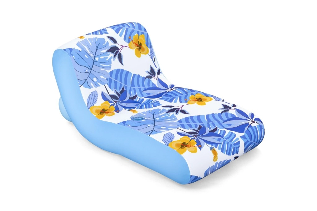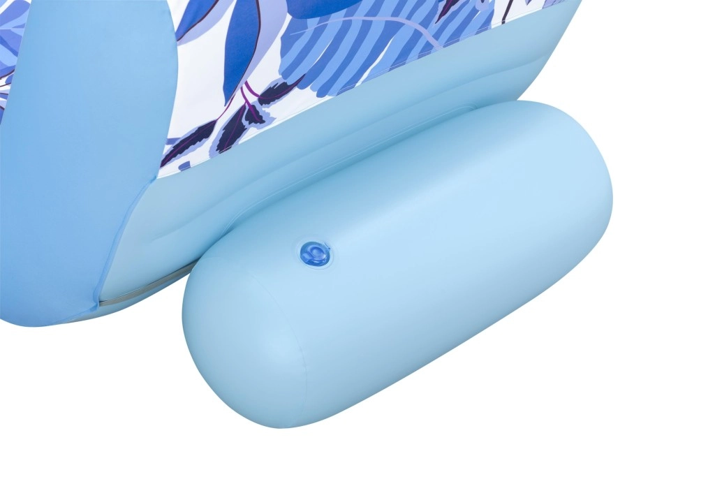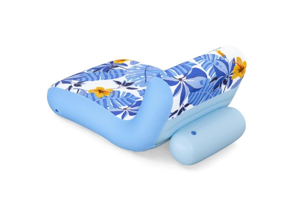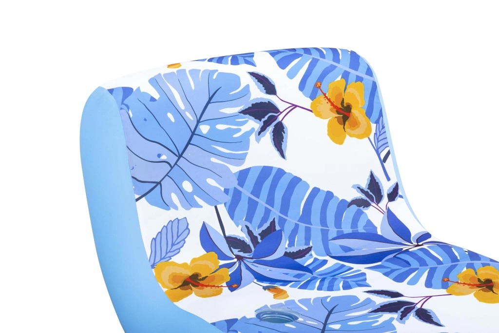 La superficie è composta da un rivestimento tessile removibile con motivo tropicale di foglie blu e fiori gialli. Il rivestimento si lava facilmente in lavatrice ed è trattato con protezione UV UPF 50+, così i colori restano vivaci a lungo. Il corpo in PVC durevole e le due camere d’aria indipendenti aggiungono stabilità, sicurezza e resistenza all’usura quotidiana.
