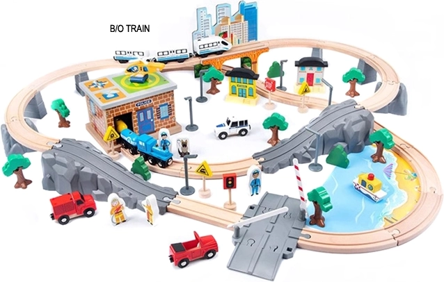 Scopri divertimento e apprendimento insieme con questa pista ferroviaria in legno a batteria con 95 pezzi, ideale per bambini dai 3 anni. La locomotiva elettrica con batteria AA si muove realisticamente sui binari, i collegamenti magnetici consentono un facile aggancio dei vagoni e i ricchi accessori come ponti, alberi, edifici e segnali stradali stimolano la fantasia e lo sviluppo della motricità. Realizzata in legno di alta qualità con vernici ecologiche, rispetta gli standard CE ed EN 71 per un gioco sicuro.