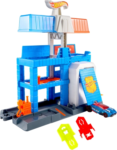 La confezione include una auto di polizia in metallo 1:64 e numerosi elementi mobili che favoriscono la motricità fine e l'immaginazione. Grazie ai connettori compatibili, il set si collega facilmente ad altre piste HOT WHEELS per costruire ampi circuiti cittadini.