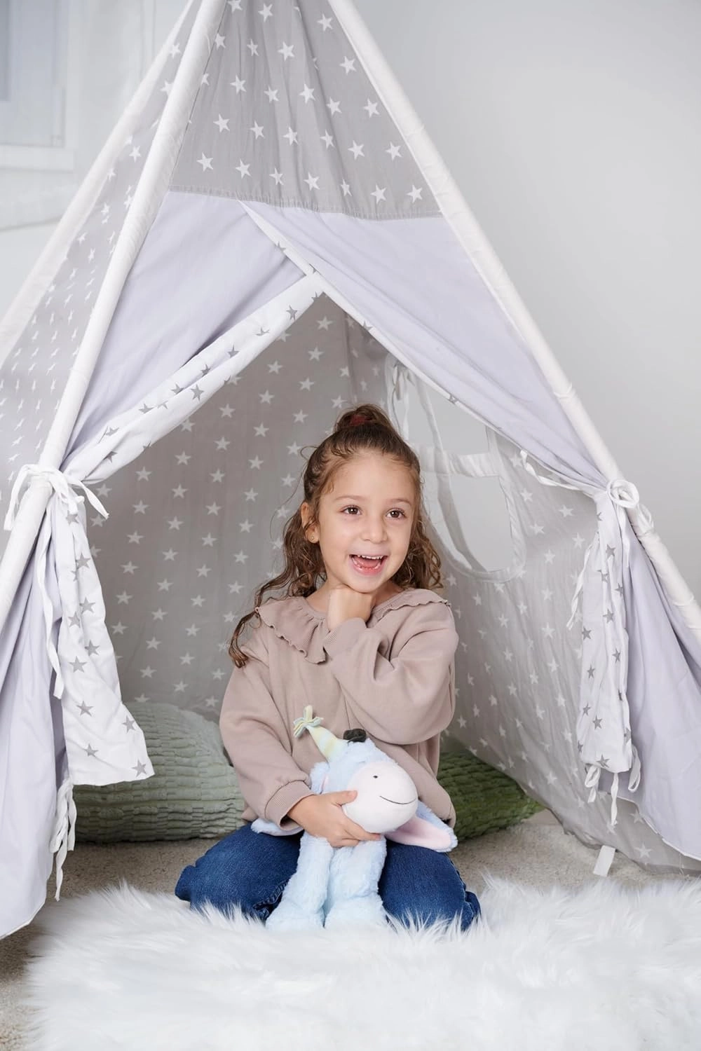 Il design seduto mantiene la forma, perfetto su una mensola, nell’angolo lettura o nel teepee. Una splendida decorazione e un giocattolo in uno.