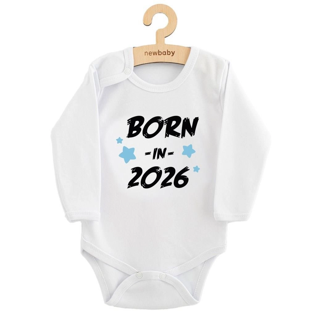 Elegante body per neonati a maniche lunghe NEW BABY Born in 2026 realizzato in 100% cotone per il massimo comfort e delicatezza sulla pelle sensibile. Le pratiche chiusure a pressione su spalla e cavallo facilitano la vestizione e il cambio. La stampa è realizzata con colori certificati adatti ai bambini, per garantire sicurezza e qualità.