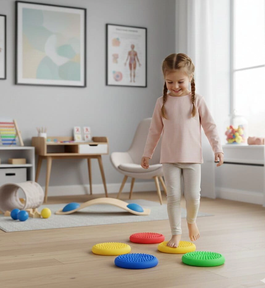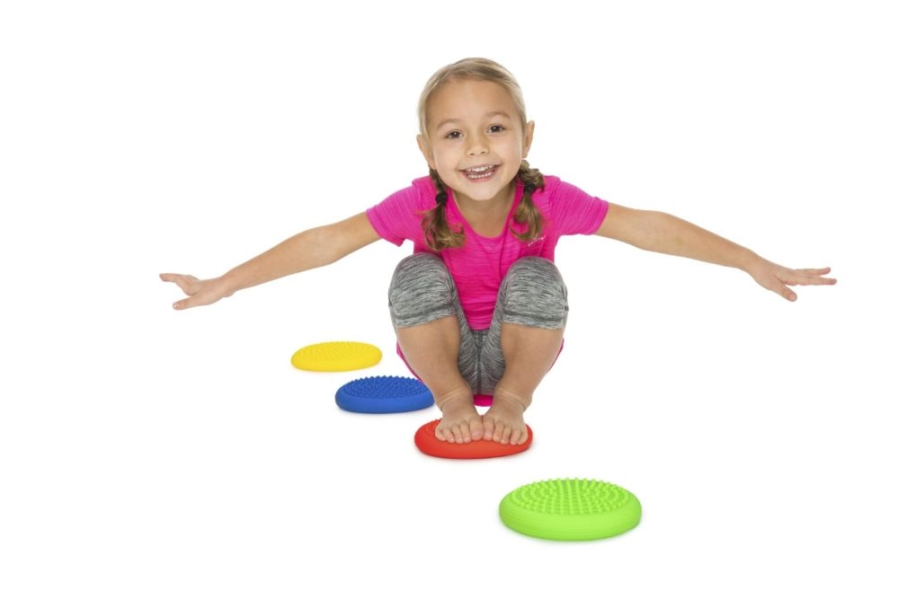 I dischi colorati motivano i bambini al movimento, sviluppano la coordinazione, la propriocezione e rinforzano il sistema stabilizzatore profondo.