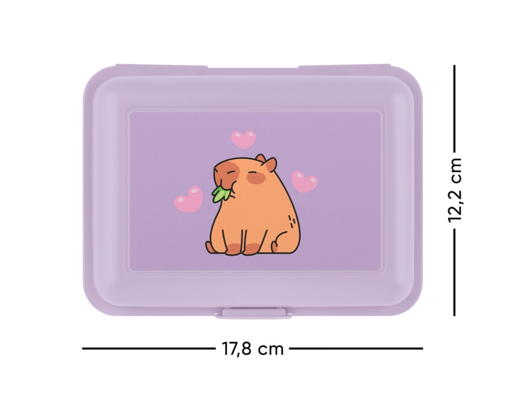 Pratico e resistente porta pranzo in elegante colore viola con motivo Capibara. Grazie alla chiusura semplice con un solo gancio e alla paratia interna divisoria, mantiene gli alimenti ben separati e freschi. Ottima scelta per la scuola, le gite e l’uso quotidiano.