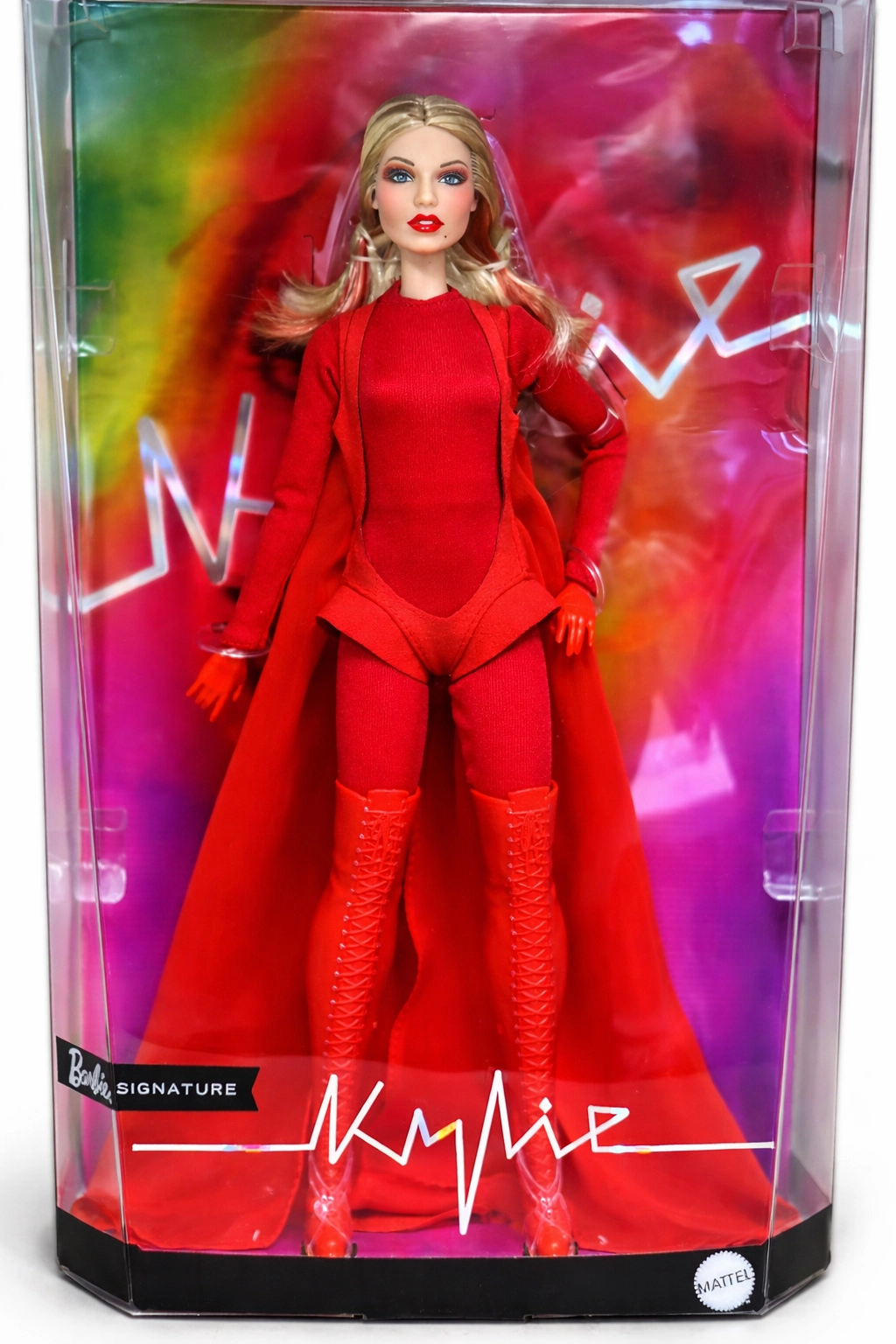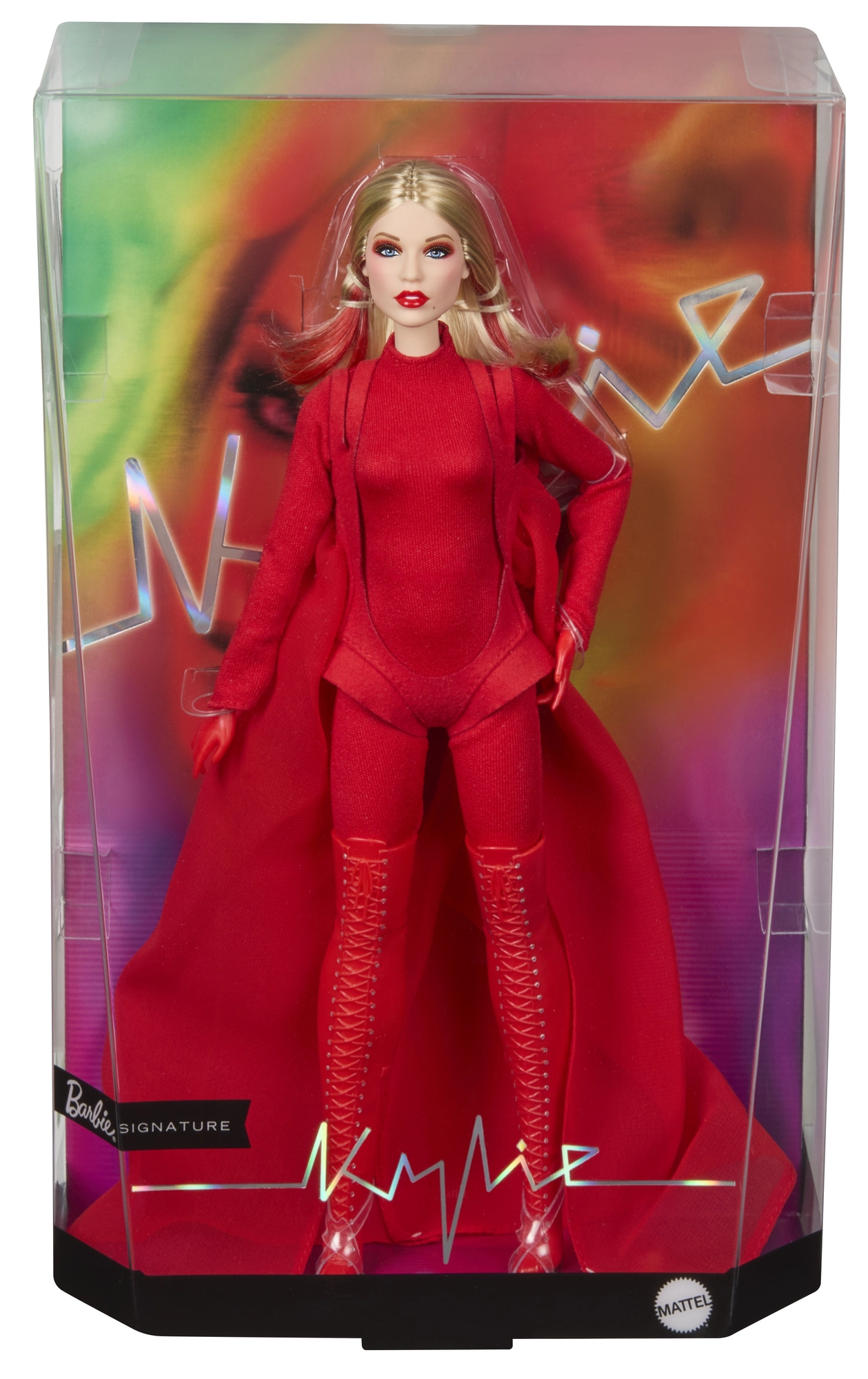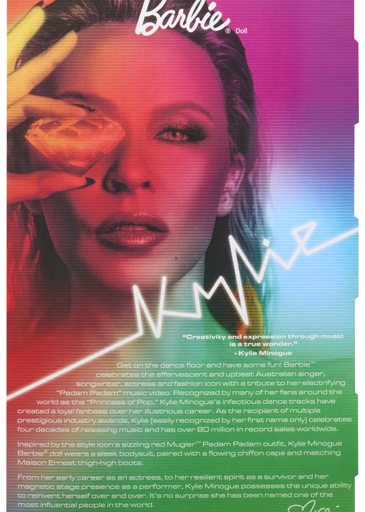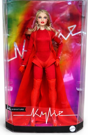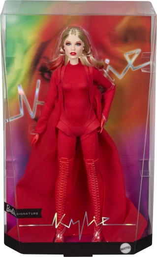Questa edizione da collezione di Barbie rende omaggio alle donne ispiratrici della serie Role Models. La bambola raffigura Kylie Minogue in una drammatica styling rossa ispirata a un video musicale, con lunghi capelli biondi e delicati riflessi rossi, occhi azzurri e make-up preciso per un look autentico da palcoscenico.