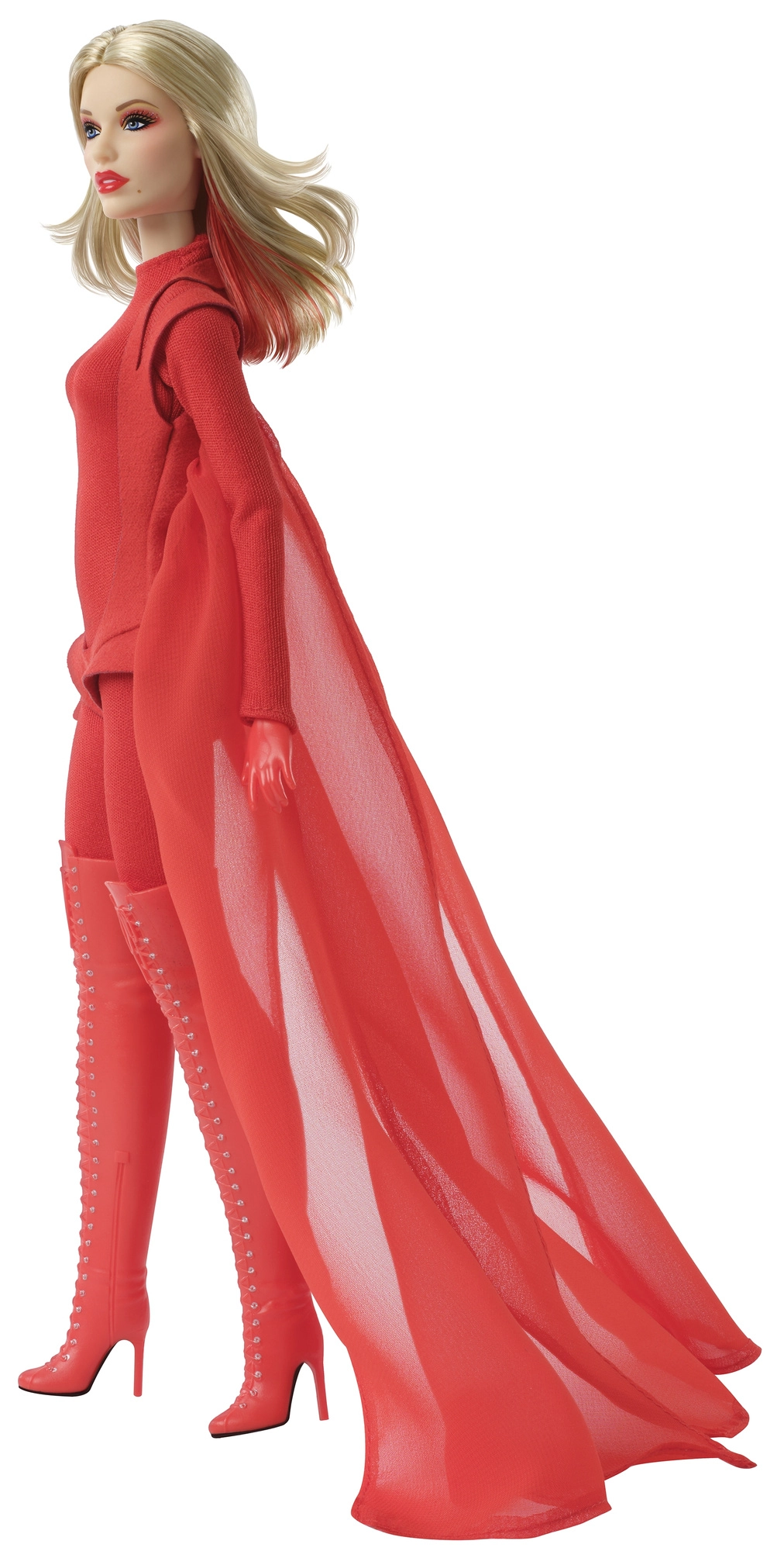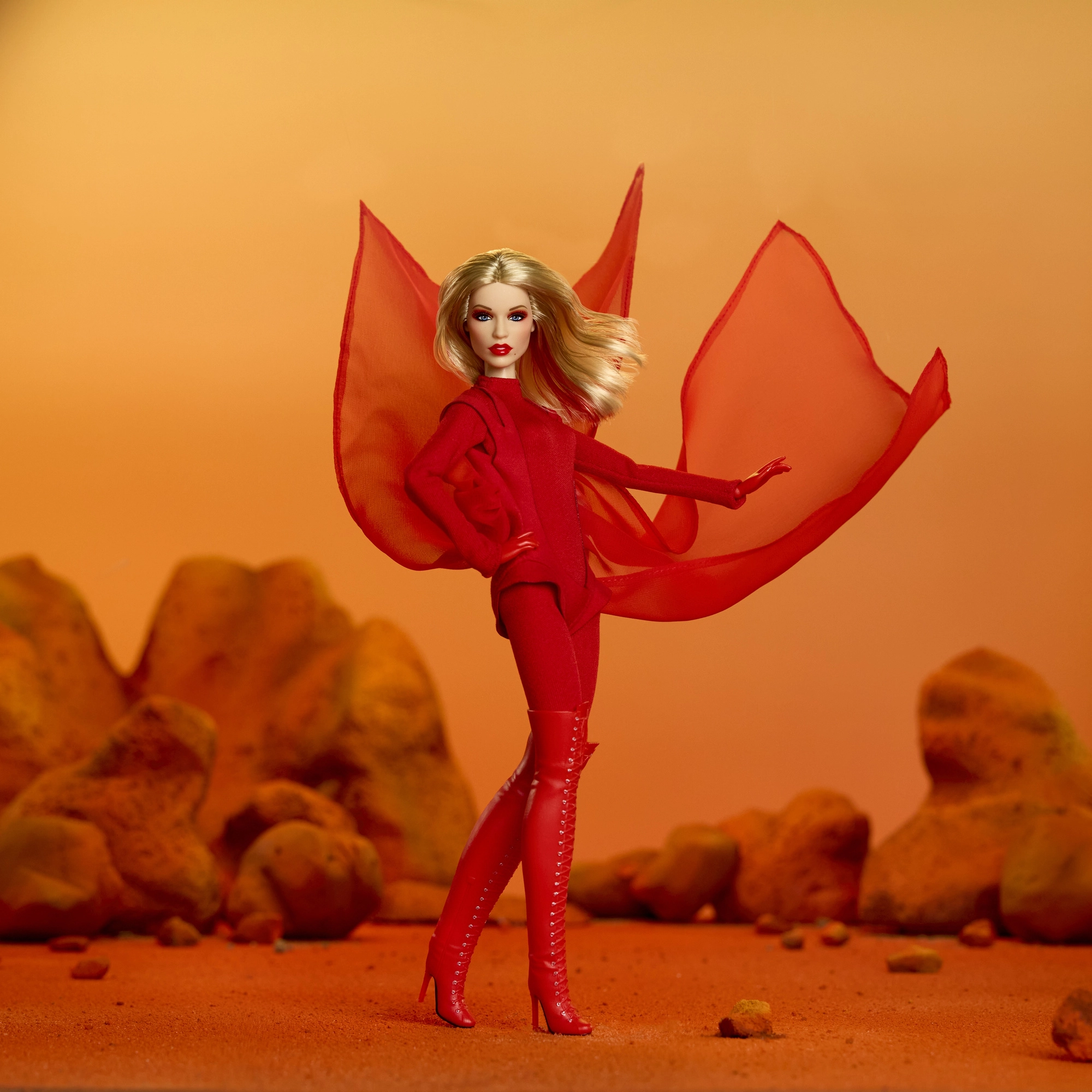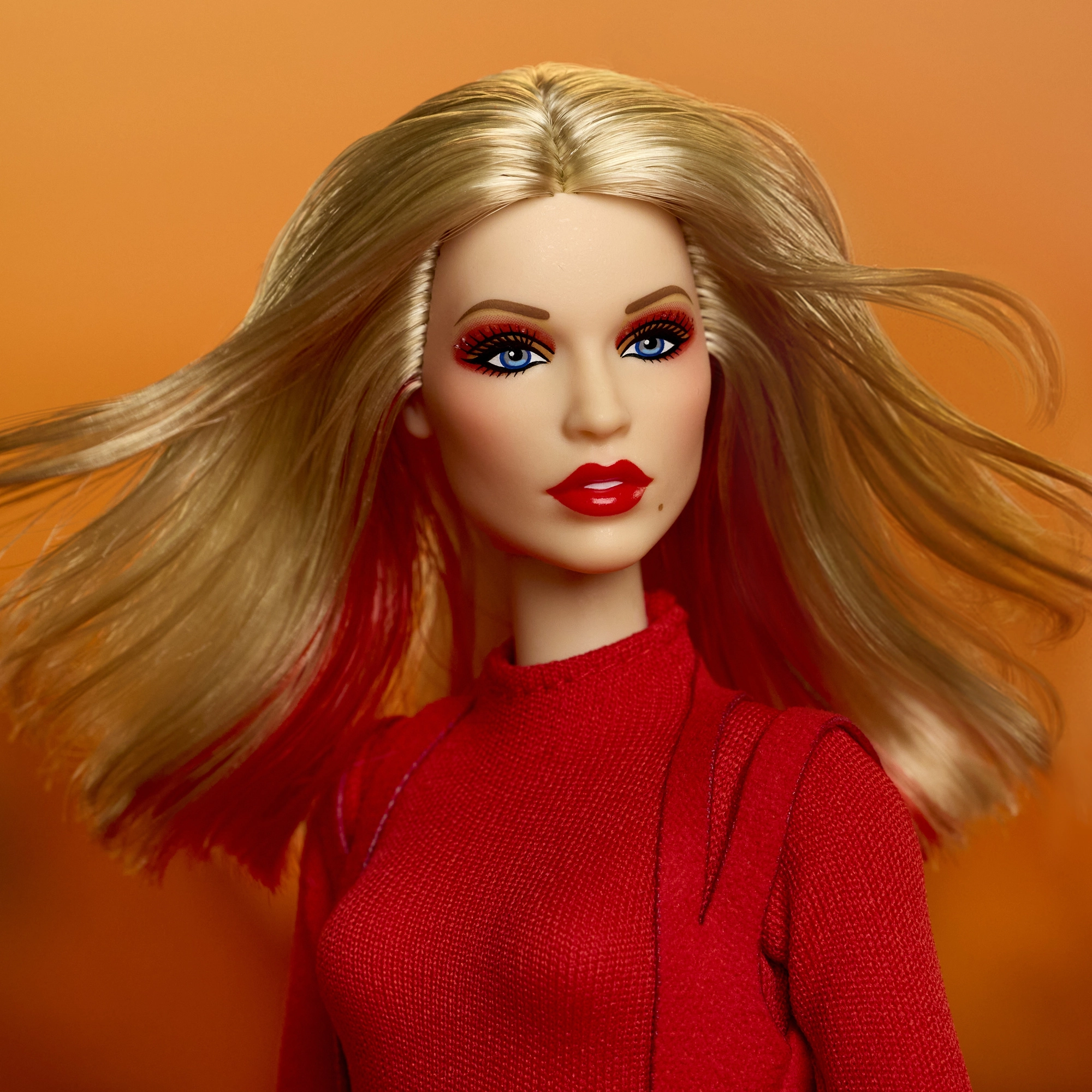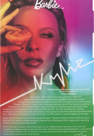 Questa edizione da collezione di Barbie rende omaggio alle donne ispiratrici della serie Role Models. La bambola raffigura Kylie Minogue in una drammatica styling rossa ispirata a un video musicale, con lunghi capelli biondi e delicati riflessi rossi, occhi azzurri e make-up preciso per un look autentico da palcoscenico.