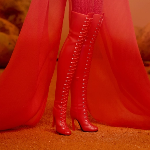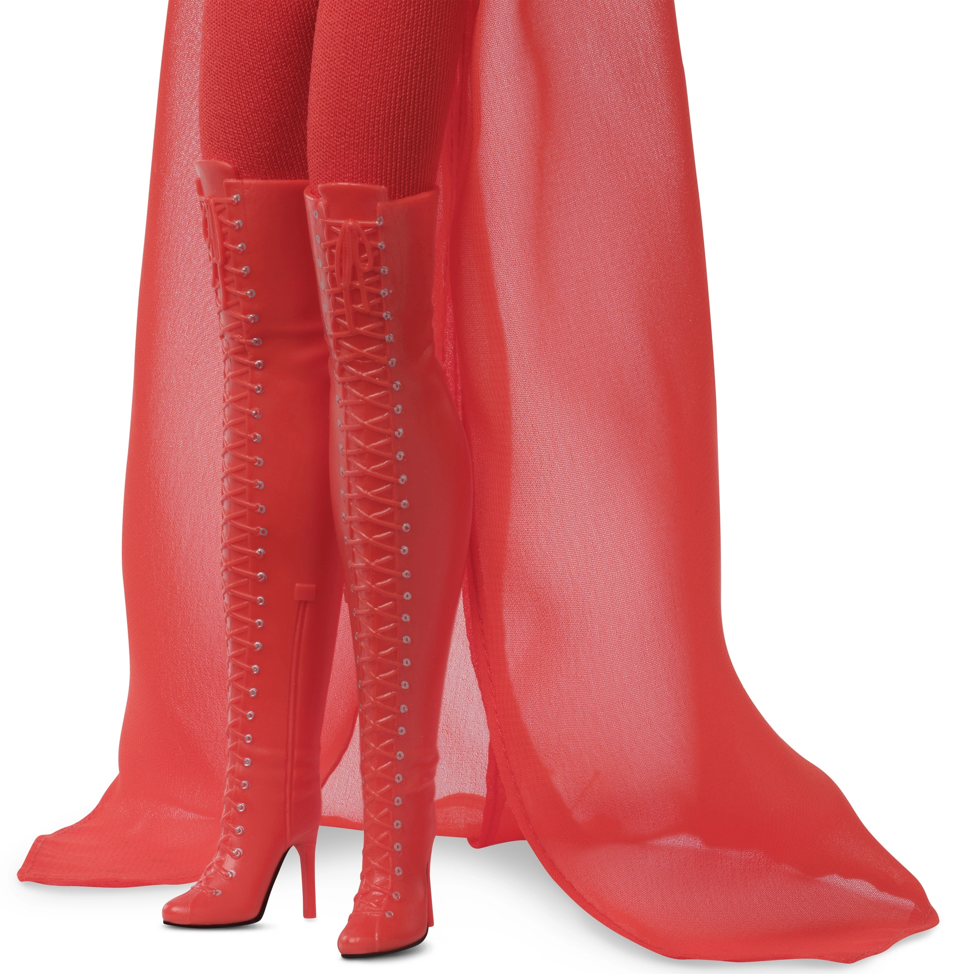 - Design per i fan del pop: vivaci tonalità di rosso, mantello scenografico e dettagli moda.