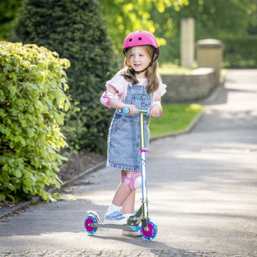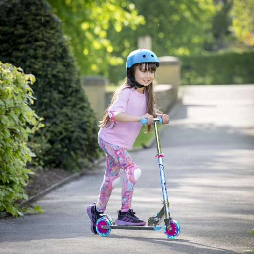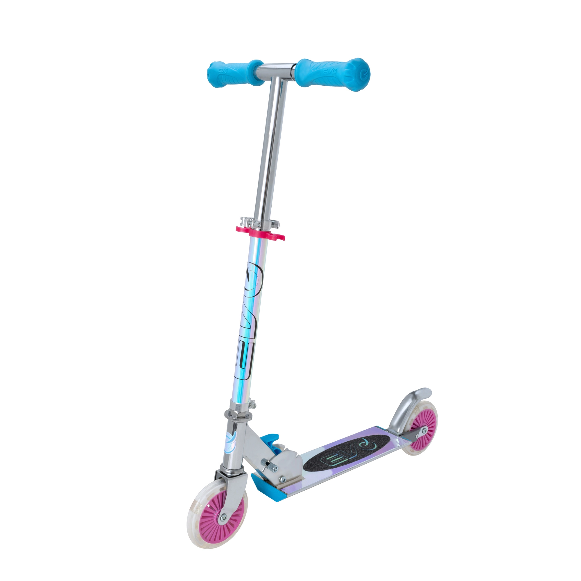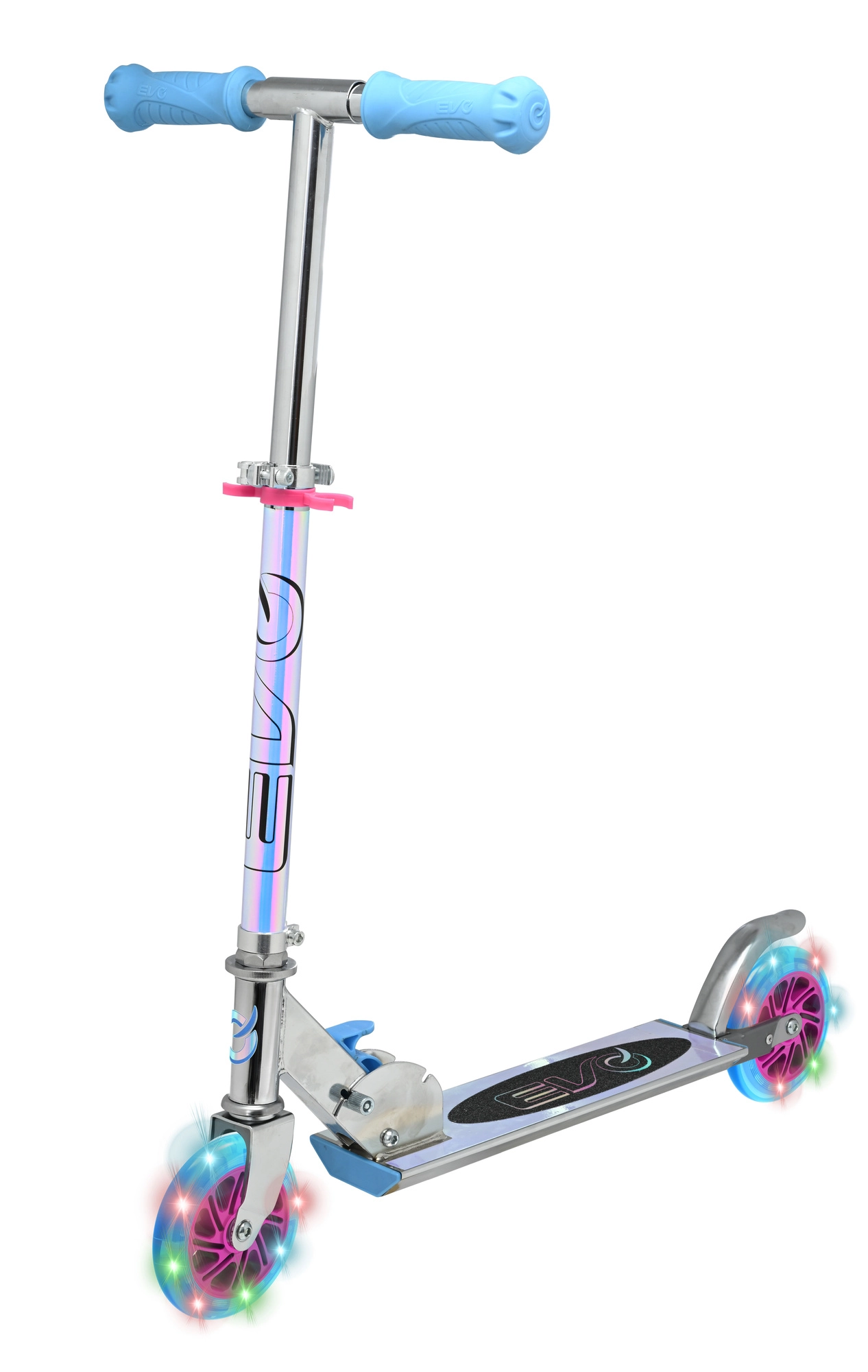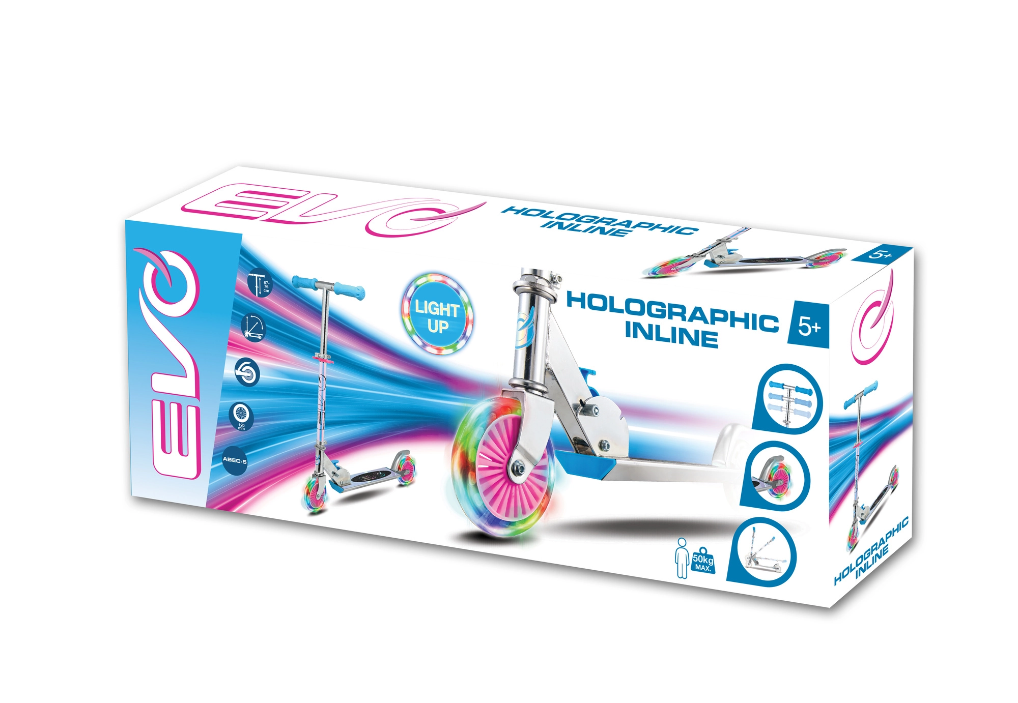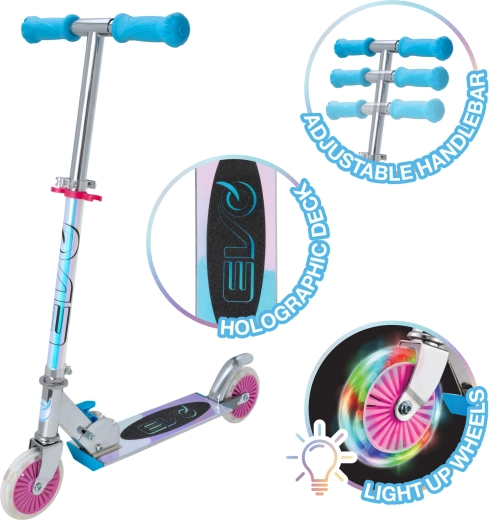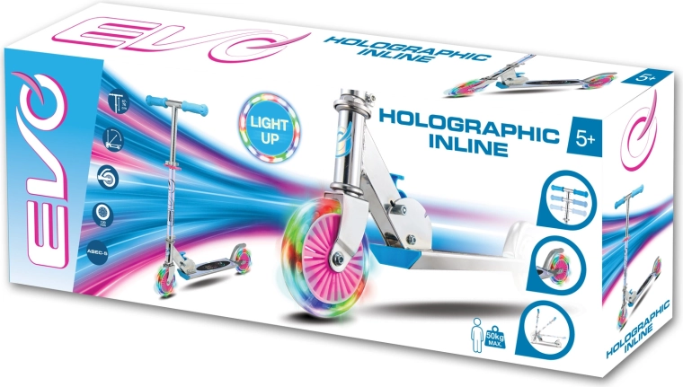 Il monopattino EVO Holographic Inline unisce divertimento e sicurezza. Grazie alle ruote LED luminose ogni corsa è più accattivante, mentre l’altezza regolabile del manubrio (ca. 67–77 cm) permette di adattarsi comodamente alla crescita del bambino. La struttura pieghevole facilita il trasporto e il riponimento in casa o nel bagagliaio dell’auto.