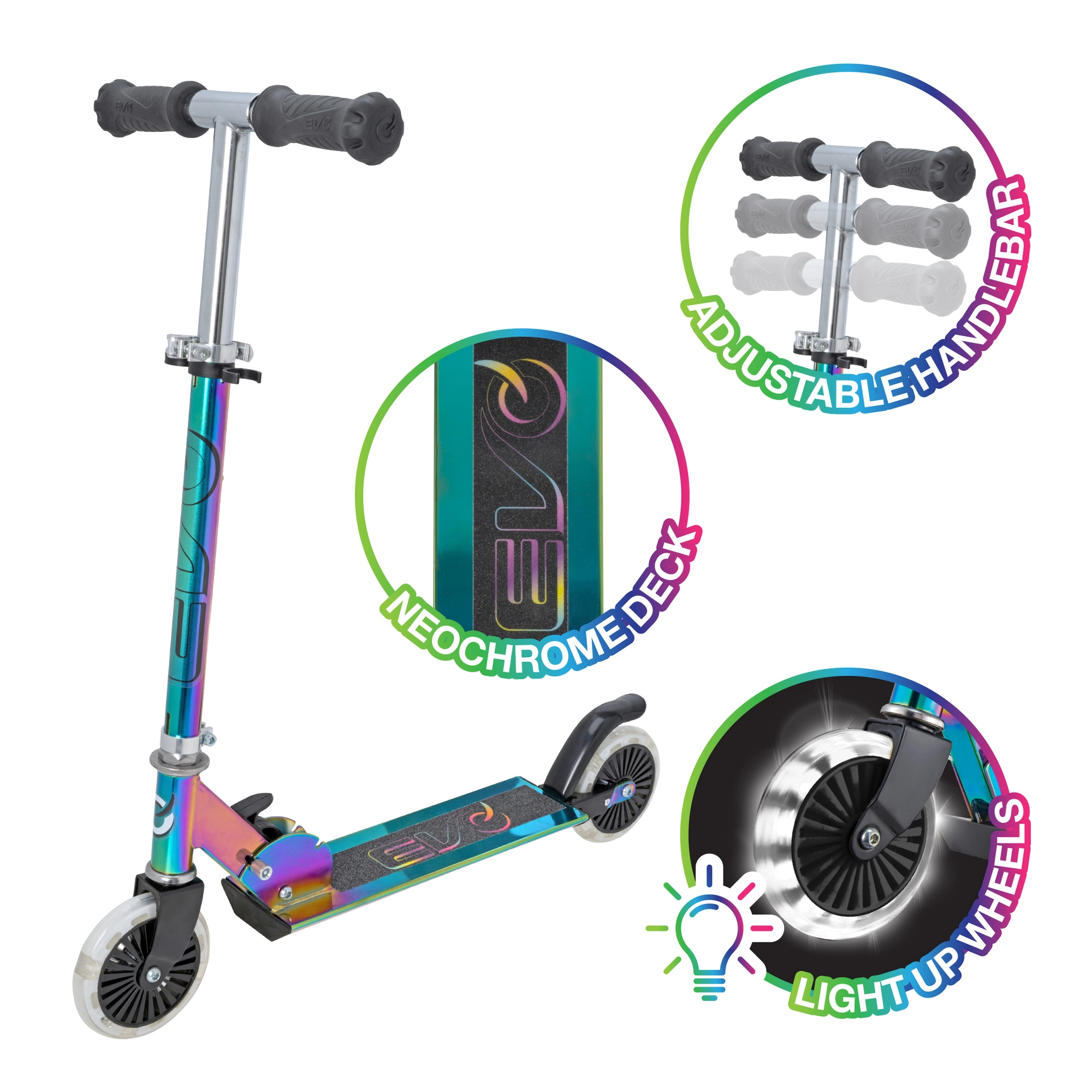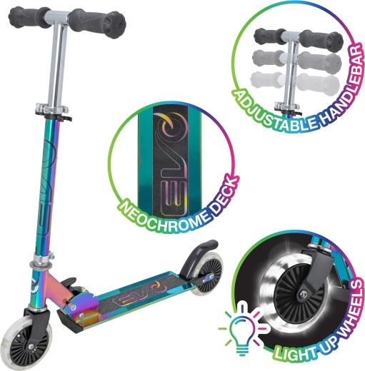 Il monopattino EVO Light Up Neochrome è una scelta eccellente per i piccoli rider che vogliono distinguersi. Grazie al manubrio regolabile (circa 67–77 cm) cresce con il bambino, il meccanismo pieghevole facilita trasporto e riporre, e la robusta struttura in metallo con pedana antiscivolo offre sicurezza durante la guida.