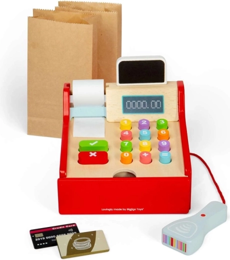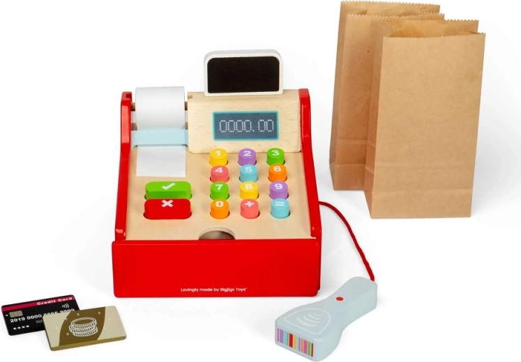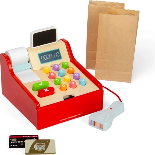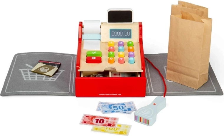 Un'elegante cassa in legno per piccoli negozianti trasforma ogni negozietto dei bambini in un punto vendita realistico. I bambini possono scansionare la merce, calcolare i prezzi, emettere una ricevuta e accettare pagamenti con carta e contanti. I grandi pulsanti per le piccole mani, lo scanner incluso e gli accessori favoriscono il gioco di ruolo, lo sviluppo della comunicazione, delle abilità sociali e della alfabetizzazione finanziaria. Realizzata in legno FSC® – rispettoso dell'ambiente e resistente per il gioco quotidiano.