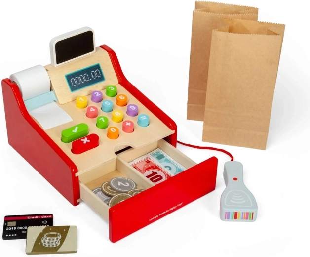 - Cassa in legno, scanner manuale, cassetto per monete e banconote, denaro finto, carta di pagamento, borse di carta