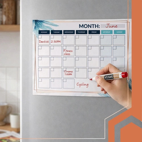 La superficie cancellabile a secco consente di scrivere e cancellare ripetutamente senza disordine. Il retro magnetico forte garantisce un fissaggio stabile sul frigorifero o su altre superfici metalliche. L'utile sezione note mantiene le informazioni importanti sempre a portata di mano e i pennarelli colorati evidenziano le priorità.