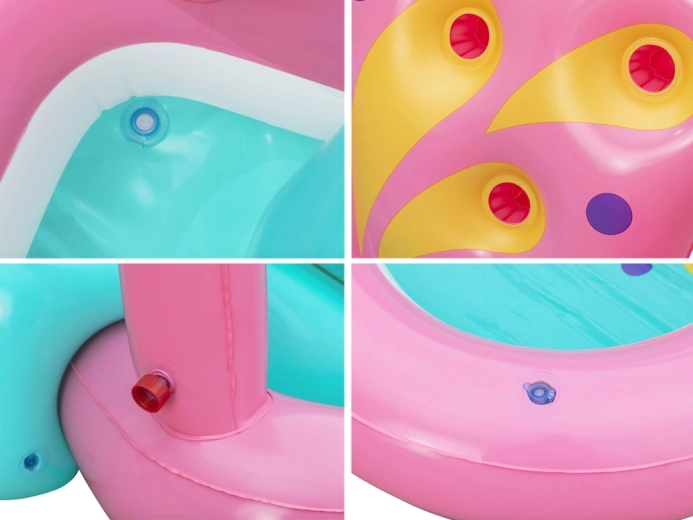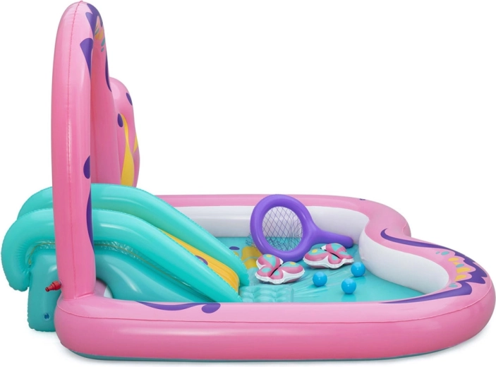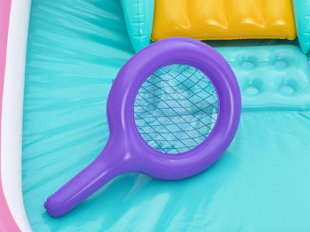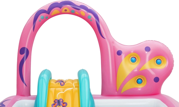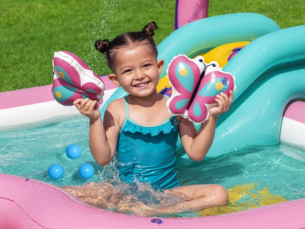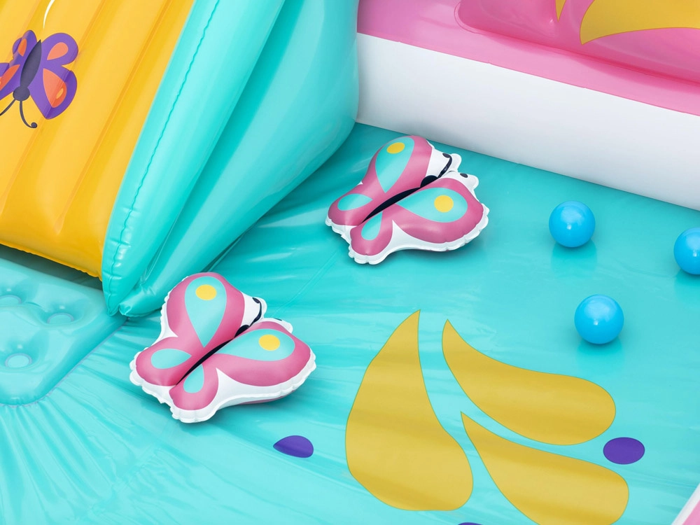 Il set include divertenti giochi galleggianti e elementi gonfiabili a forma di farfalla e anelli. Le pareti morbide e gli atterraggi imbottiti aumentano comfort e sicurezza. Il vinile resistente è facile da pulire e la toppa di riparazione in dotazione prolunga la durata del prodotto. Basta collegare il tubo, gonfiare e il divertimento può iniziare.