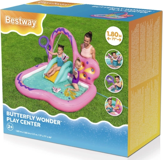 Il centro giochi acquatico gonfiabile Bestway Farfalla trasforma il giardino in un luogo sicuro e pieno di allegria. Grazie alle dimensioni compatte 180 × 180 × 117 cm entra anche negli spazi più piccoli, offrendo comunque tante attività: scivolata verso una zona bassa per spruzzi, doccia ad arco collegabile al tubo da giardino e fori per il lancio e la selezione delle palline, che sviluppano la motricità fine.