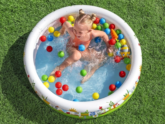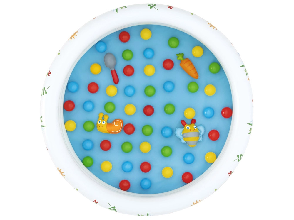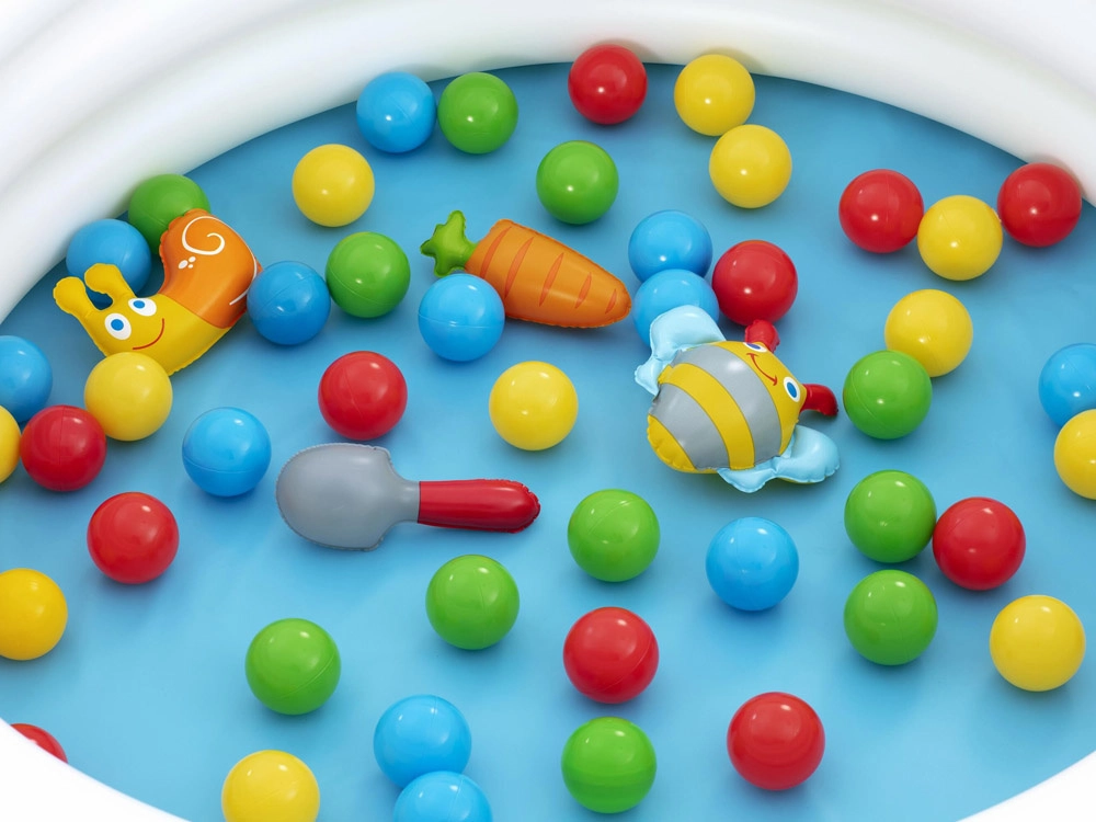 Il set comprende 46 palline colorate e 4 ovetti-sorpresa apribili con adorabili giocattoli (ad es. lumachina, ape, carota, paletta), che stimolano curiosità e creatività. Installazione semplice, manutenzione facile e la pezza di riparazione inclusa garantiscono un uso senza pensieri.